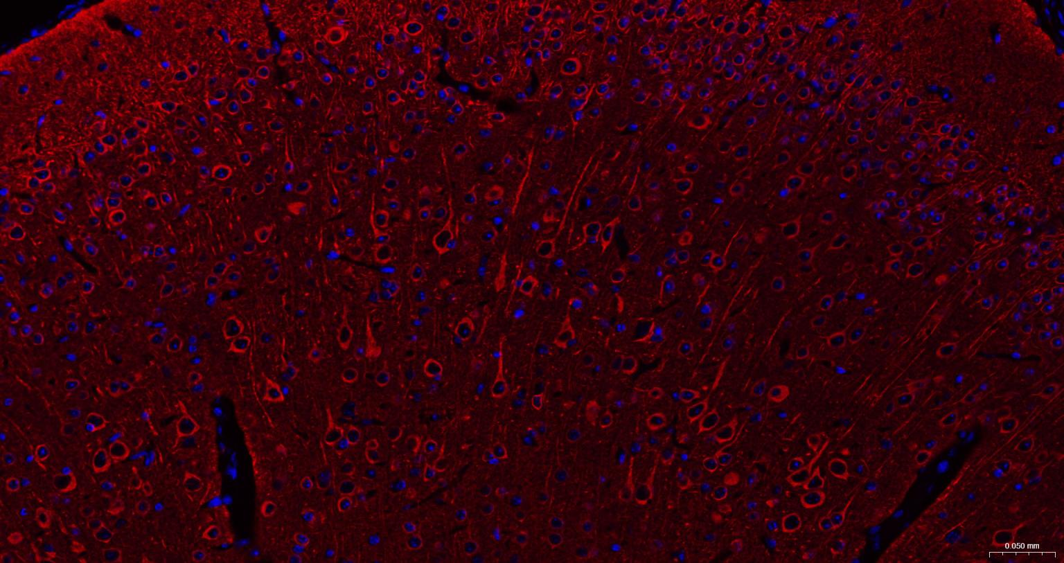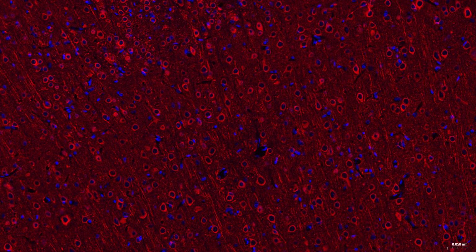 Paraformaldehyde-fixed, paraffin embedded Rat Cerebrum; Antigen retrieval by boiling in sodium citrate buffer (pH6.0) for 15 min; The section was incubated with Tubulin beta-III Monoclonal Antibody, Unconjugated (bsm-52323R) at 1:200 overnight at 4°C. Followed by conjugated Goat Anti-Rabbit IgG antibody (Red, bs-0295G-BF594), DAPI (blue, C02-04002) was used to stain the cell nuclei.