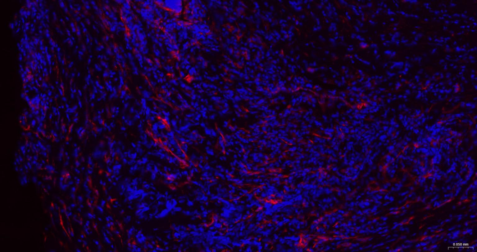 Paraformaldehyde-fixed, paraffin embedded Human Thyroid tumor; Antigen retrieval by boiling in sodium citrate buffer (pH6.0) for 15 min; The section was incubated with Tubulin beta-III Monoclonal Antibody, Unconjugated (bsm-52323R) at 1:200 overnight at 4°C. Followed by conjugated Goat Anti-Rabbit IgG antibody (Red, bs-0295G-BF594), DAPI (blue, C02-04002) was used to stain the cell nuclei.