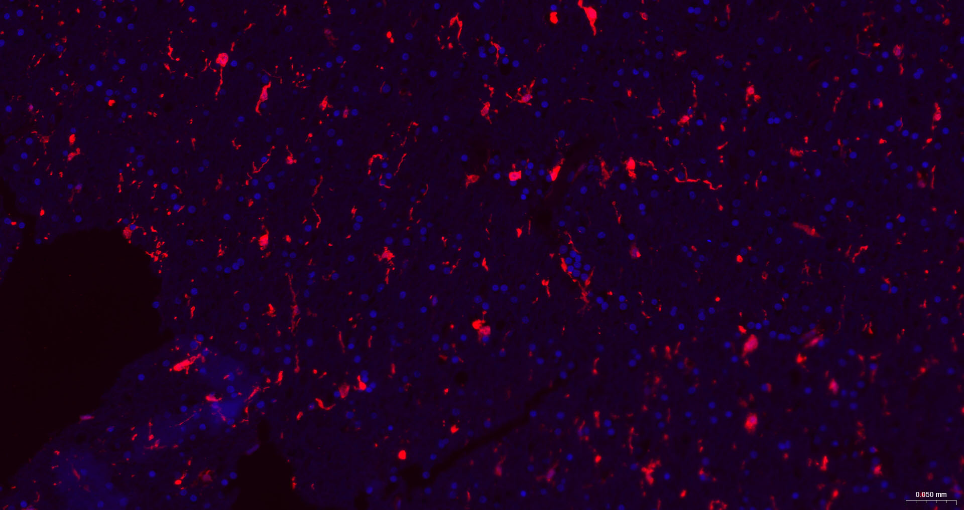 Paraformaldehyde-fixed, paraffin embedded Mouse Cerebrum; Antigen retrieval by boiling in sodium citrate buffer (pH6.0) for 15 min; The section was incubated with AIF1 Monoclonal Antibody, Unconjugated (bsm-54132R) at 1:200 overnight at 4°C. Followed by conjugated Goat Anti-Rabbit IgG antibody (Red, bs-0295G-BF594), DAPI (blue, C02-04002) was used to stain the cell nuclei.