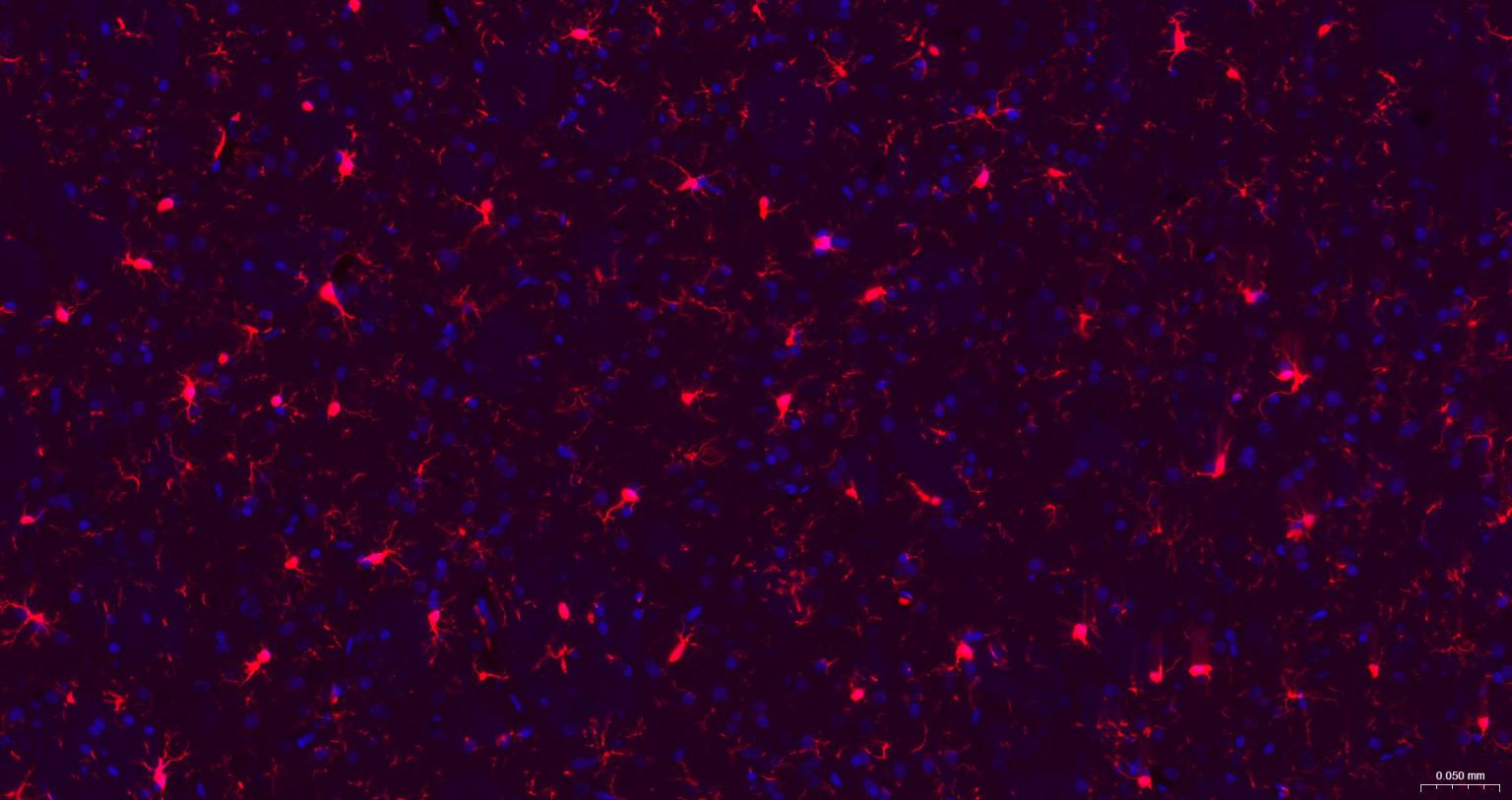 Paraformaldehyde-fixed, paraffin embedded Rat Cerebrum; Antigen retrieval by boiling in sodium citrate buffer (pH6.0) for 15 min; The section was incubated with AIF1 Monoclonal Antibody, Unconjugated (bsm-54132R) at 1:200 overnight at 4°C. Followed by conjugated Goat Anti-Rabbit IgG antibody (Red, bs-0295G-BF594), DAPI (blue, C02-04002) was used to stain the cell nuclei.