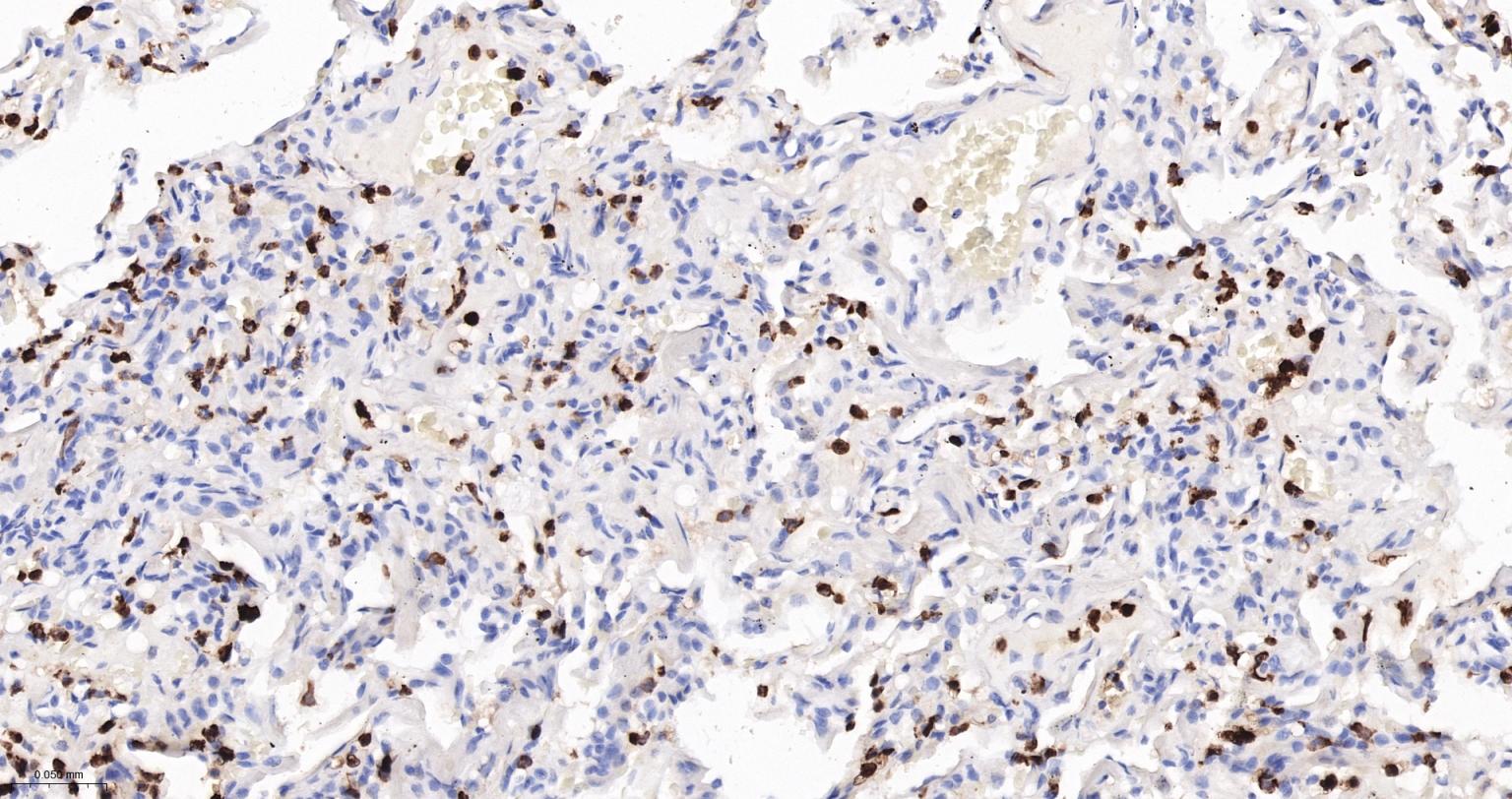 Paraformaldehyde-fixed, paraffin embedded Human Lung; Antigen retrieval by boiling in sodium citrate buffer (pH6.0) for 15 min; The section was incubated with S100-A8/A9 Monoclonal Antibody, Unconjugated (bsm-41227M) at 1:200 overnight at 4°C, followed by conjugation to the bs-40296G-HRP and DAB (C-0010) staining.