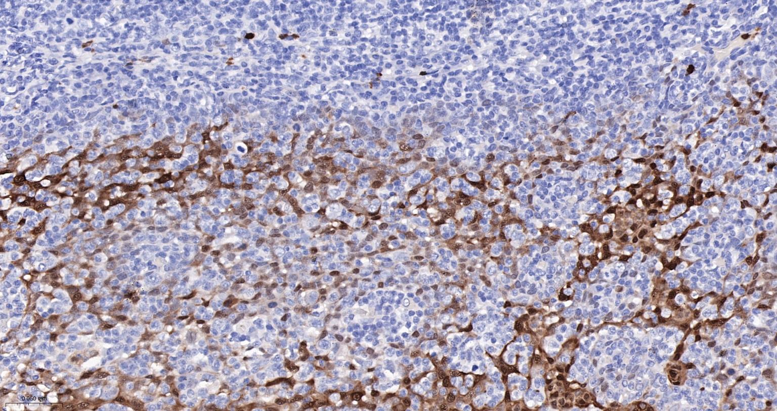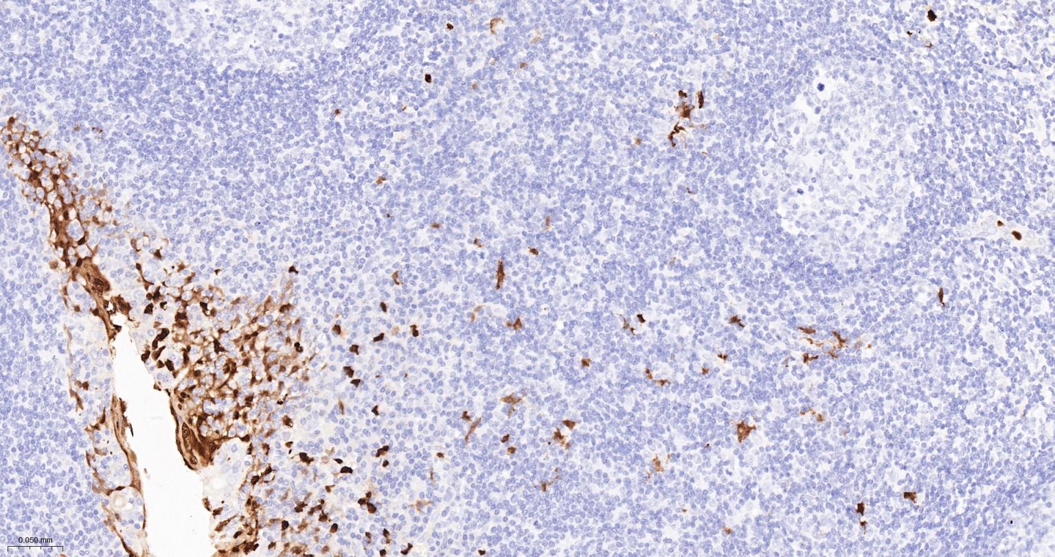 Paraformaldehyde-fixed, paraffin embedded Human Lymph; Antigen retrieval by boiling in sodium citrate buffer (pH6.0) for 15 min; The section was incubated with S100-A8/A9 Monoclonal Antibody, Unconjugated (bsm-41227M) at 1:200 overnight at 4°C, followed by conjugation to the bs-40296G-HRP and DAB (C-0010) staining.