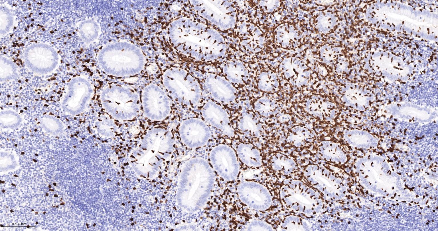 Paraformaldehyde-fixed, paraffin embedded Human purulent appendicitis; Antigen retrieval by boiling in sodium citrate buffer (pH6.0) for 15 min; The section was incubated with S100-A8/A9 Monoclonal Antibody, Unconjugated (bsm-41227M) at 1:200 overnight at 4°C, followed by conjugation to the bs-40296G-HRP and DAB (C-0010) staining.