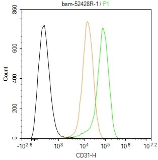 The THP-1 (H) cells were incubated in 5%BSA to block non-specific protein-protein interactions (30 min at r.t.) , followed by secondary antibody incubation for 40 min at room temperature. Primary Antibody (green): Rabbit Anti-CD31 antibody (bsm-52428R,1:100); Isotype Control (orange): Rabbit IgG (bs-0295P). Blank control (black): PBS. Acquisition of 20,000 events was performed.
