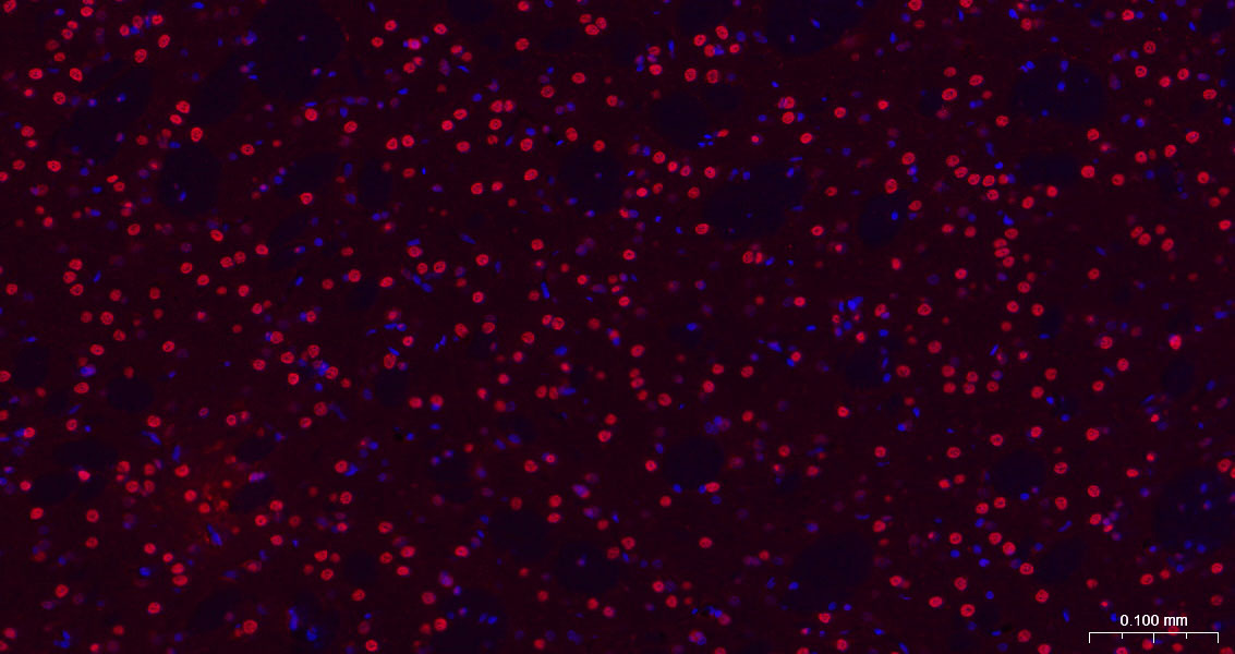 Paraformaldehyde-fixed, paraffin embedded Human Cerebrum; Antigen retrieval by boiling in sodium citrate buffer (pH6.0) for 15 min; The section was incubated with HES1 Monoclonal Antibody, Unconjugated (bsm-52568R) at 1:200 overnight at 4°C. Followed by conjugated Goat Anti-Rabbit IgG antibody (Red, bs-0295G-BF594), DAPI (blue, C02-04002) was used to stain the cell nuclei.
