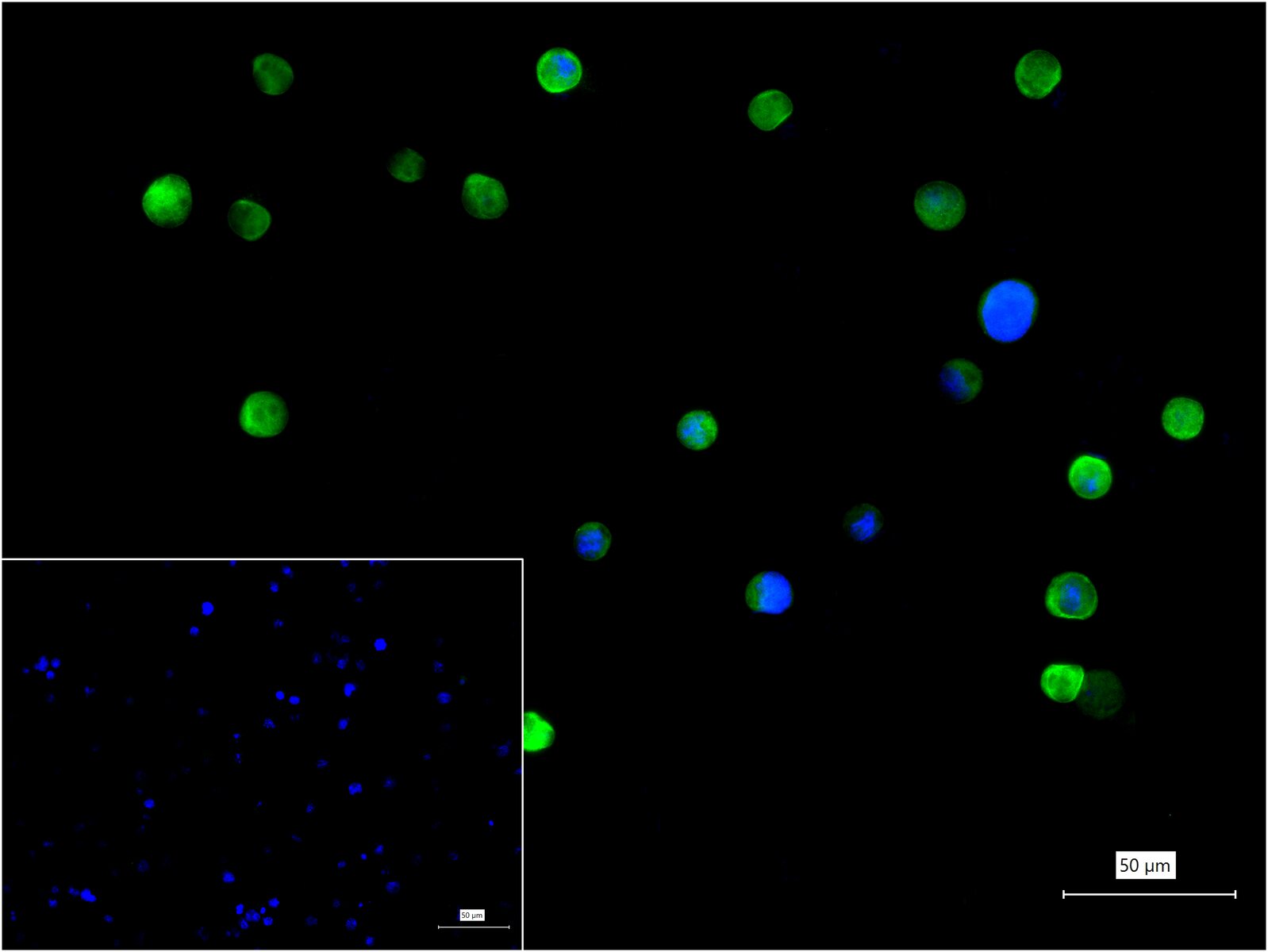 4% Paraformaldehyde-fixed Jurkat (H) cell; Triton X-100 at r.t. for 20 min; Antibody incubation with (Hsp90 alpha) monoclonal Antibody, unconjugated (bsm-52353R) 1:100, 90 min at 37°C; followed by BF488 conjugated Goat Anti-Rabbit IgG antibody (green, bs-60295G-BF488) at 37°C for 90 min, DAPI (blue, C02-04002) was used to stain the cell nuclei. PBS instead of the primary antibody was used as the blank control.