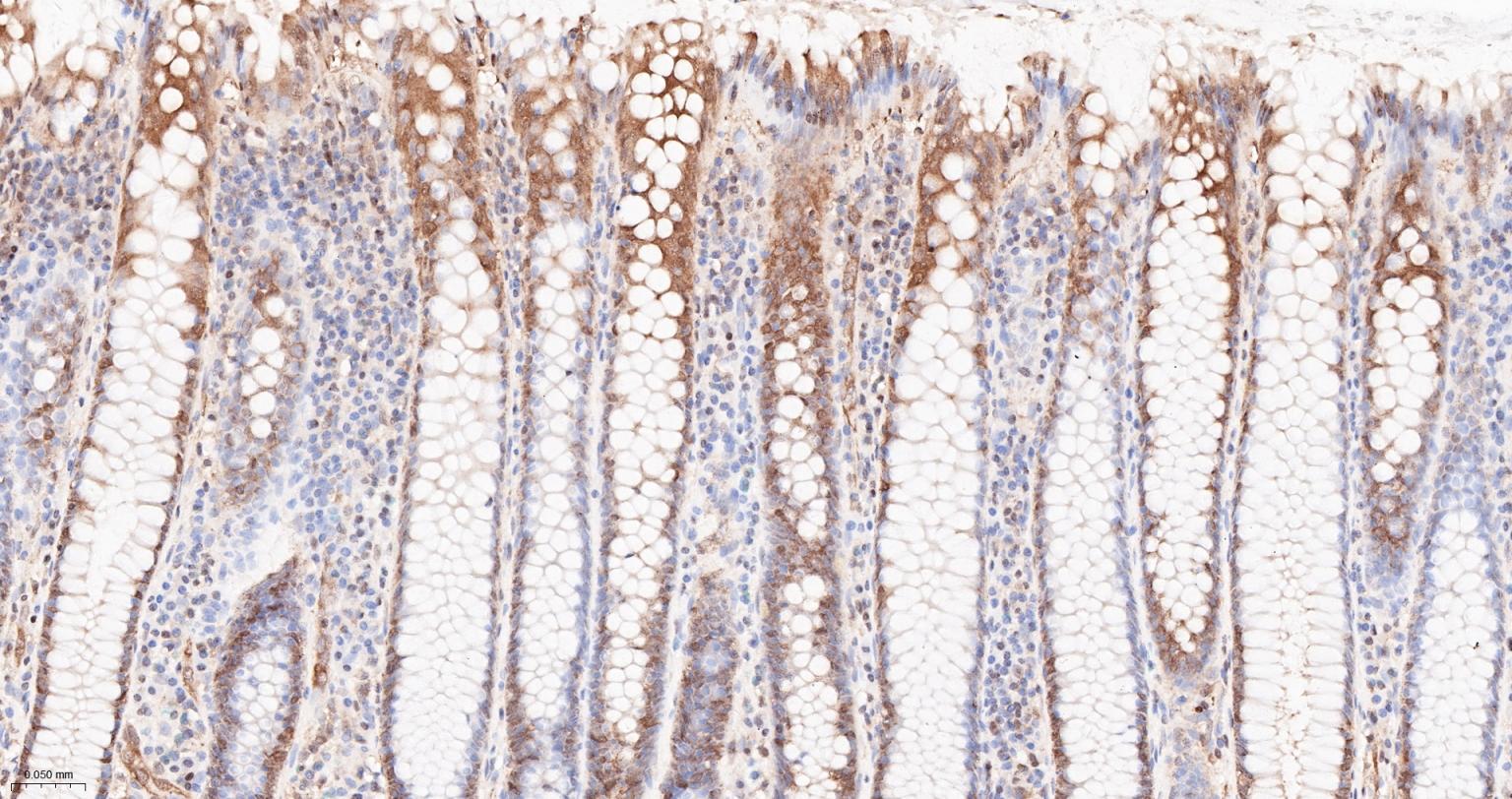 Paraformaldehyde-fixed, paraffin embedded Mouse Colon; Antigen retrieval by boiling in sodium citrate buffer (pH6.0) for 15 min; Antibody incubation with Hsp90 alpha Monoclonal Antibody, Unconjugated(bsm-52353R) at 1:200 overnight at 4°C, followed by conjugation to the SP Kit (Rabbit, SP-0023) and DAB (C-0010) staining.