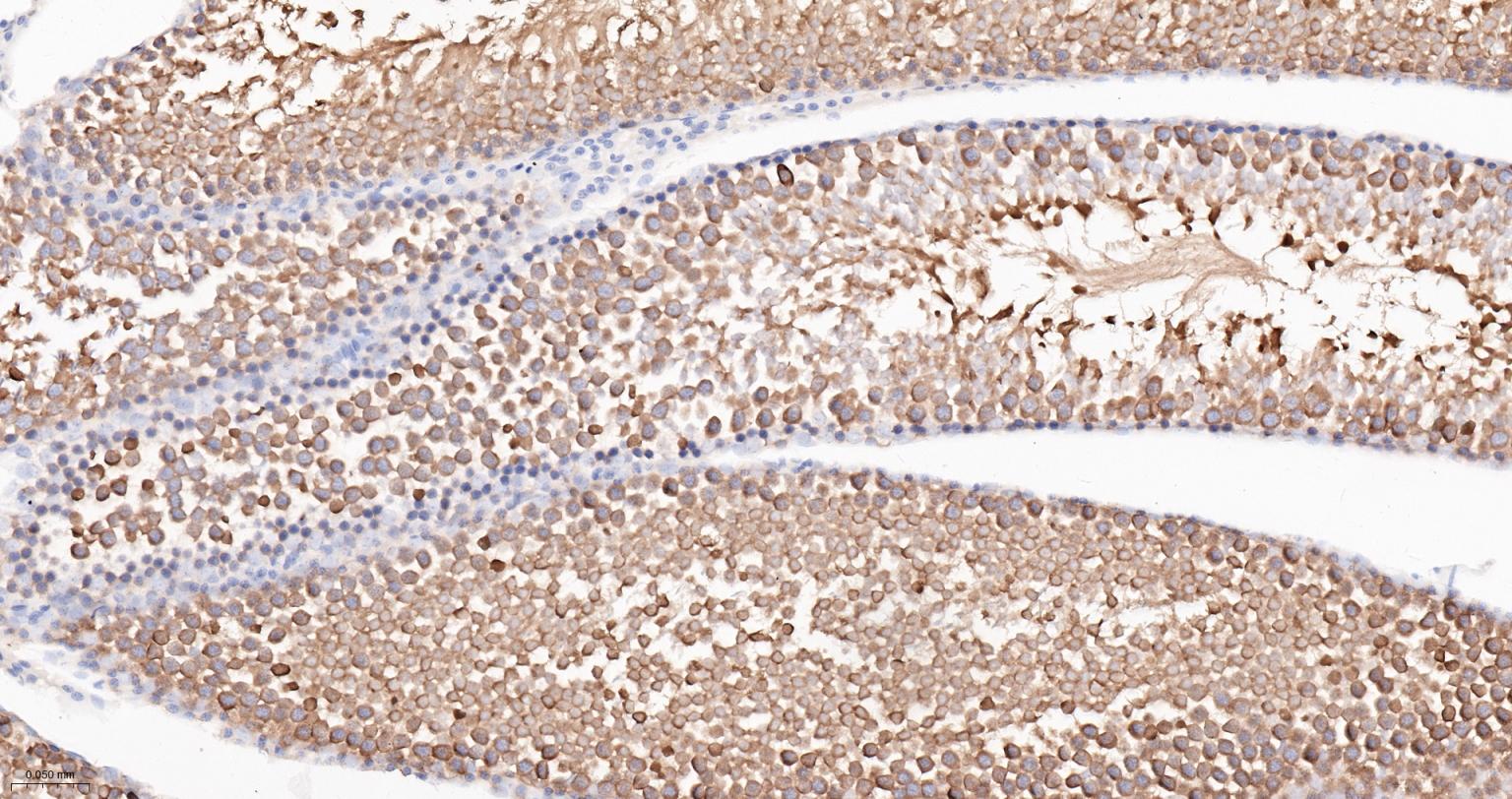 Paraformaldehyde-fixed, paraffin embedded Rat Testicles; Antigen retrieval by boiling in sodium citrate buffer (pH6.0) for 15 min; Antibody incubation with Hsp90 alpha Monoclonal Antibody, Unconjugated(bsm-52353R) at 1:200 overnight at 4°C, followed by conjugation to the SP Kit (Rabbit, SP-0023) and DAB (C-0010) staining.
