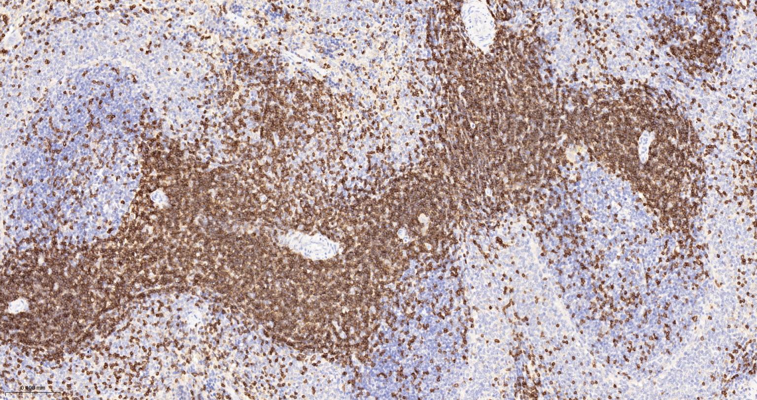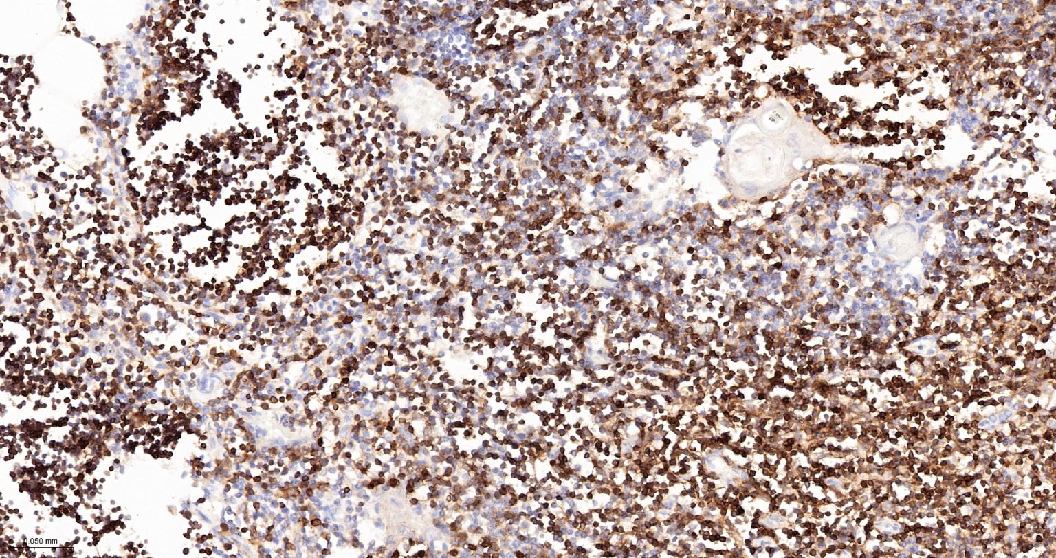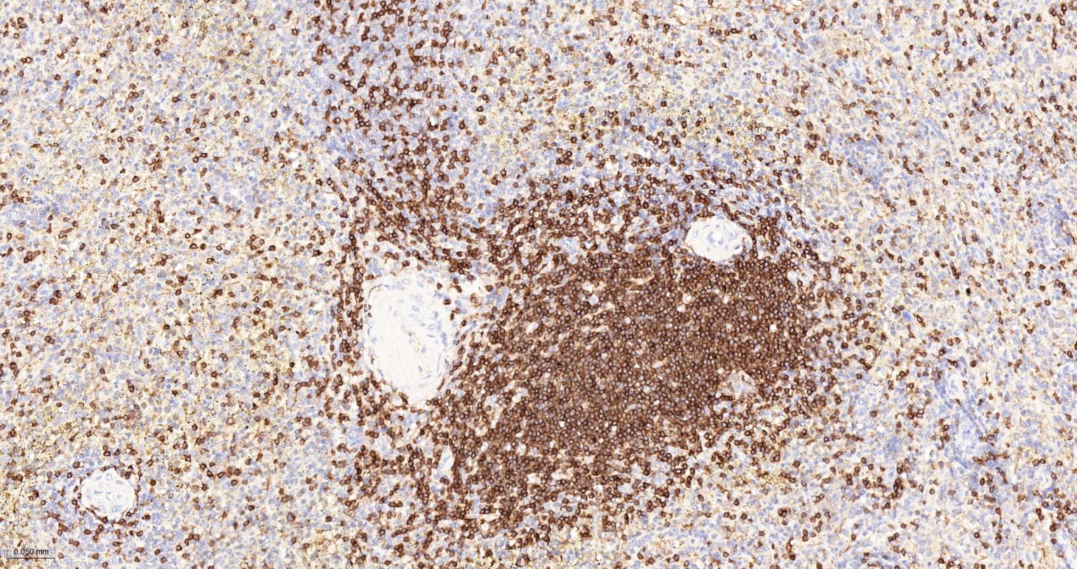 Paraformaldehyde-fixed, paraffin embedded Human Spleen; Antigen retrieval by boiling in sodium citrate buffer (pH6.0) for 15 min; The section was incubated with CD3E Monoclonal Antibody, Unconjugated (bsm-60002R) at 1:500 overnight at 4°C, followed by conjugation to the bs-0295G-HRP and DAB (C-0010) staining.