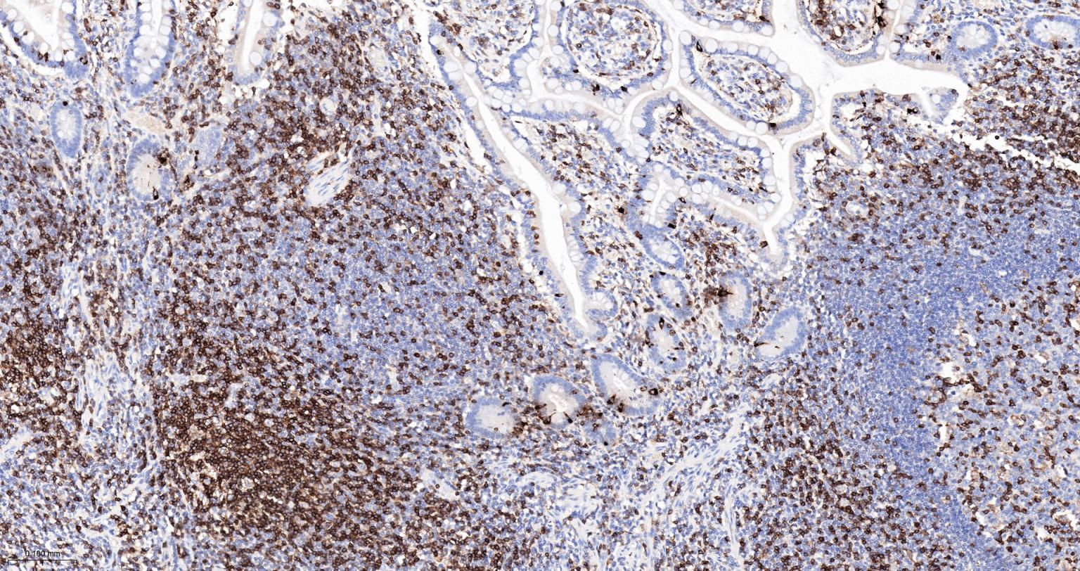 Paraformaldehyde-fixed, paraffin embedded Human small Intestine; Antigen retrieval by boiling in sodium citrate buffer (pH6.0) for 15 min; The section was incubated with CD3E Monoclonal Antibody, Unconjugated (bsm-60002R) at 1:500 overnight at 4°C, followed by conjugation to the bs-0295G-HRP and DAB (C-0010) staining.