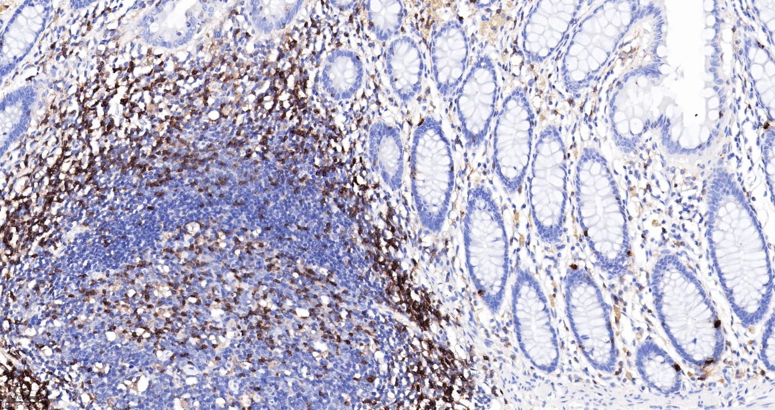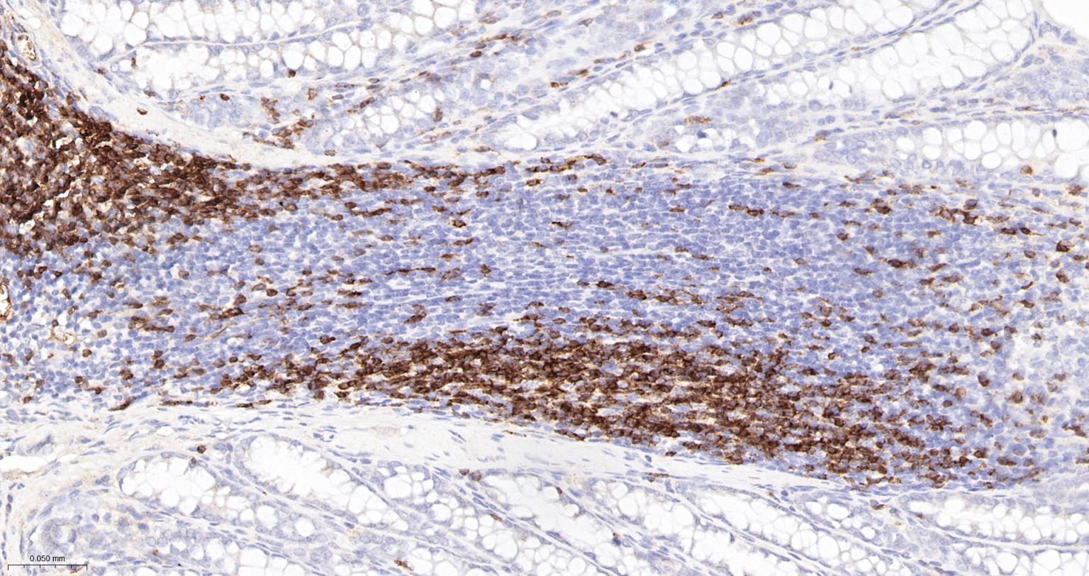 Paraformaldehyde-fixed, paraffin embedded Rat Colon; Antigen retrieval by boiling in sodium citrate buffer (pH6.0) for 15 min; The section was incubated with CD3E Monoclonal Antibody, Unconjugated (bsm-60002R) at 1:1500 overnight at 4°C, followed by conjugation to the bs-0295G-HRP and DAB (C-0010) staining.