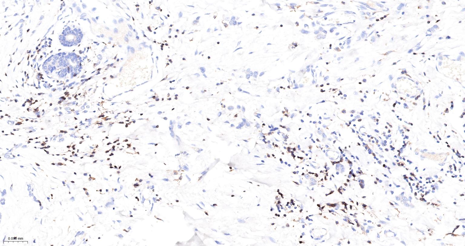 Paraformaldehyde-fixed, paraffin embedded Human Breast Cancer; Antigen retrieval by boiling in sodium citrate buffer (pH6.0) for 15 min; The section was incubated with CD3E Monoclonal Antibody, Unconjugated (bsm-60002R) at 1:500 overnight at 4°C, followed by conjugation to the bs-0295G-HRP and DAB (C-0010) staining.