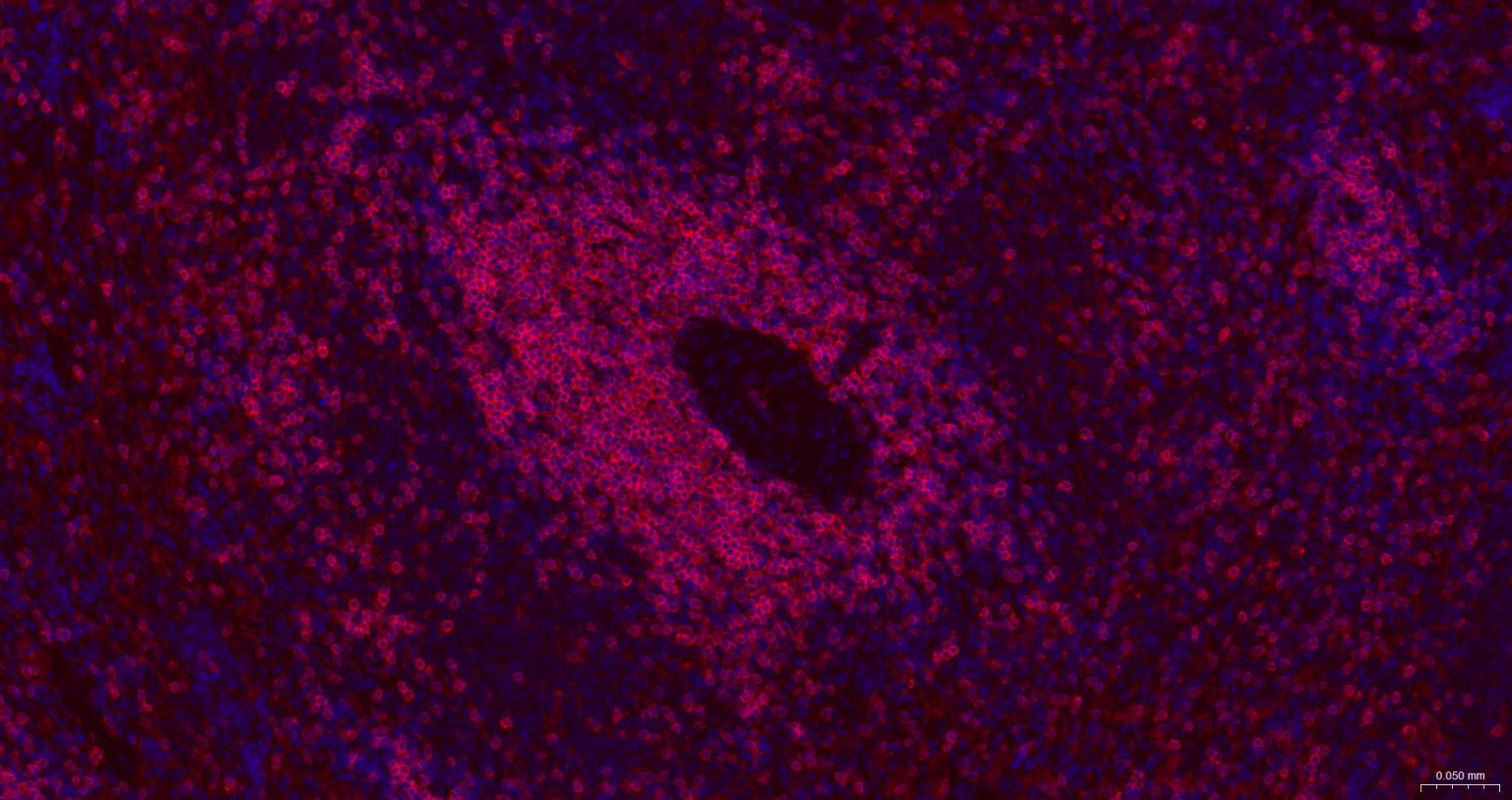 Paraformaldehyde-fixed, paraffin embedded Mouse Spleen; Antigen retrieval by boiling in sodium citrate buffer (pH6.0) for 15 min; The section was incubated with CD3E Monoclonal Antibody, Unconjugated (bsm-60002) at 1:500 overnight at 4°C. Followed by conjugated Goat Anti-Rabbit IgG antibody (Red, bs-0295G-BF594), DAPI (blue, C02-04002) was used to stain the cell nuclei.