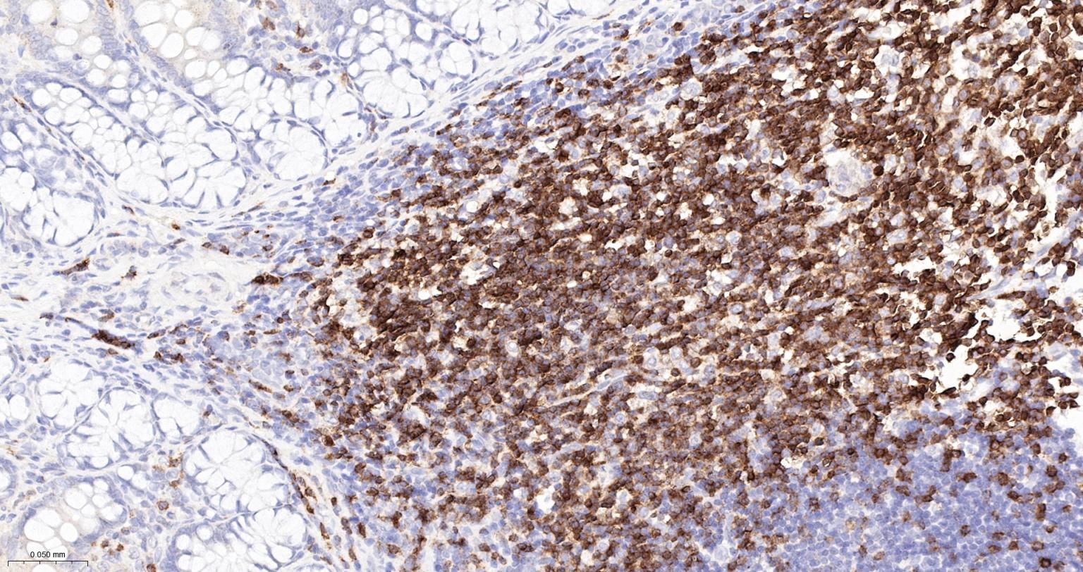 Paraformaldehyde-fixed, paraffin embedded Human Colon; Antigen retrieval by boiling in sodium citrate buffer (pH6.0) for 15 min; The section was incubated with CD3E Monoclonal Antibody, Unconjugated (bsm-60002R) at 1:500 overnight at 4°C, followed by conjugation to the bs-0295G-HRP and DAB (C-0010) staining.