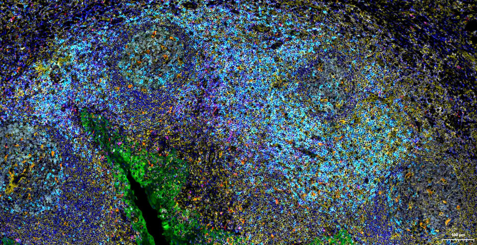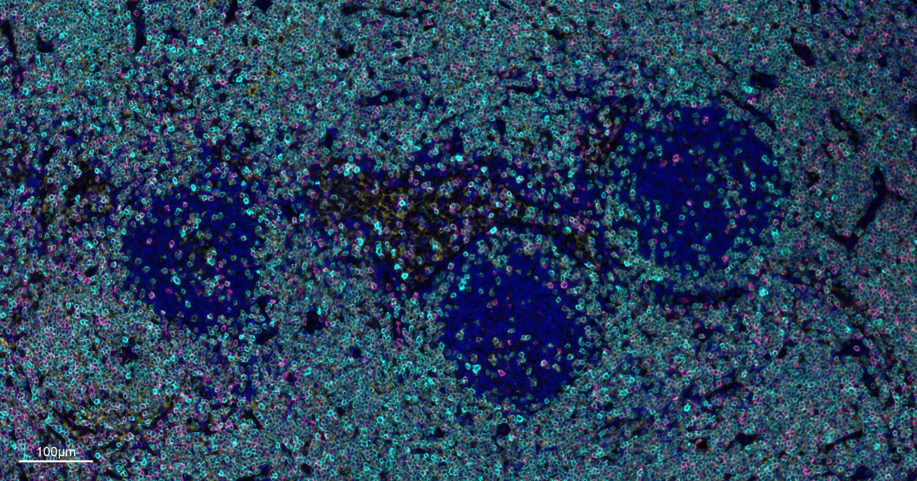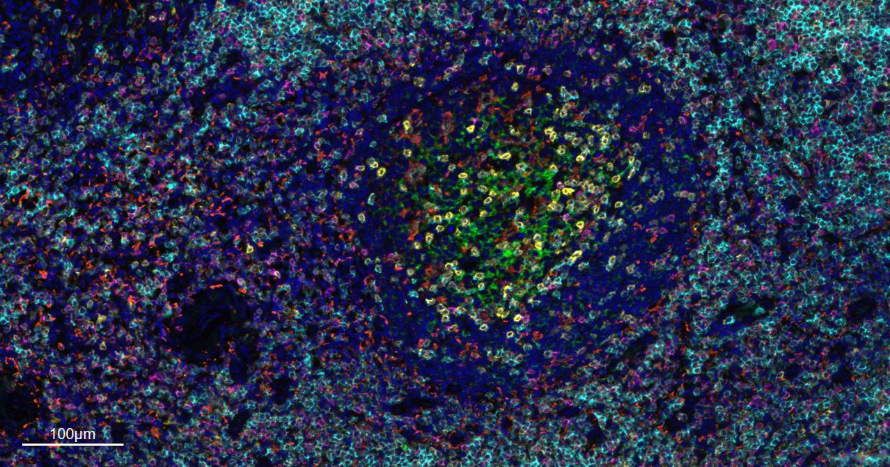 Merged staining of anti-CD8A (bsm-34251M; 1:200; pink) anti-CD4 (bsm-52469R; 1:200; light blue) anti-CD3E (bsm-60002R; 1:200; green) anti-CD68 (bsm-60634R; 1:200; white) anti-CD11c (bsm-61135R; 1:200; orange) and anti-CD20 (bsm-63327R; 1:200; yellow)
