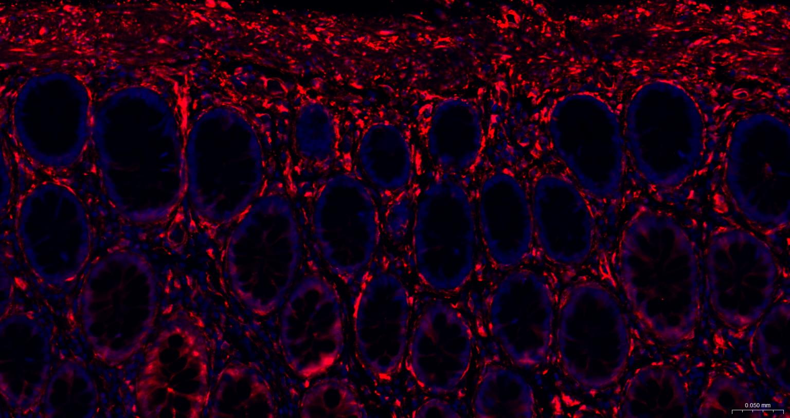 Paraformaldehyde-fixed, paraffin embedded Mouse Colon; Antigen retrieval by boiling in sodium citrate buffer (pH6.0) for 15 min; The section was incubated with Hsp27 Monoclonal Antibody, Unconjugated (bsm-52757R) at 1:200 overnight at 4°C. Followed by conjugated Goat Anti-Rabbit IgG antibody (Red, bs-0295G-BF594), DAPI (blue, C02-04002) was used to stain the cell nuclei.