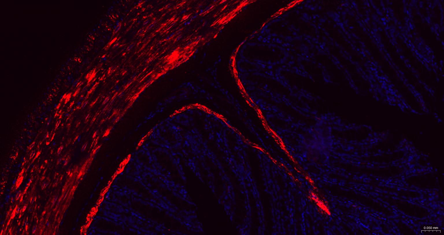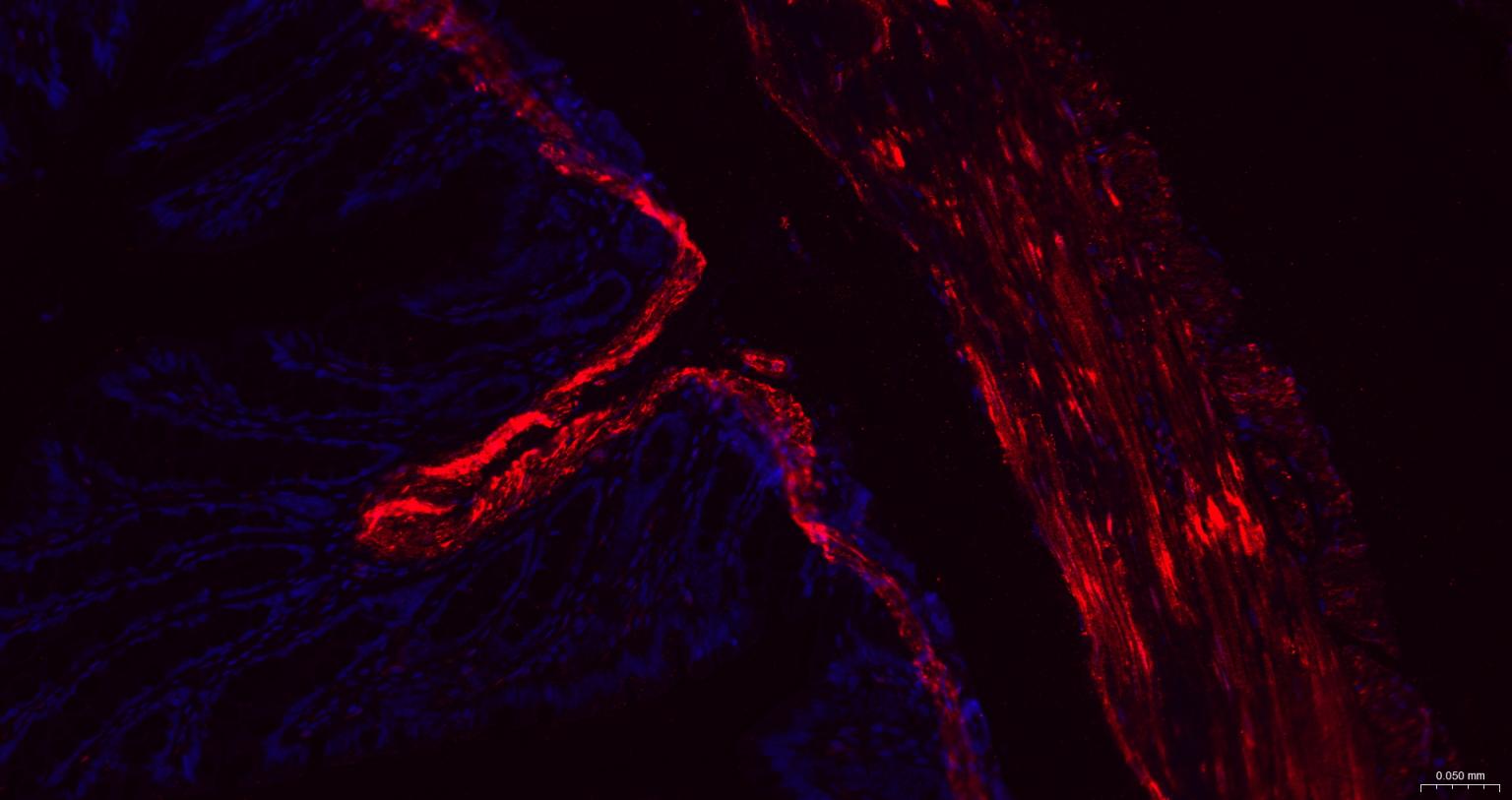 Paraformaldehyde-fixed, paraffin embedded Rat Colon; Antigen retrieval by boiling in sodium citrate buffer (pH6.0) for 15 min; The section was incubated with Hsp27 Monoclonal Antibody, Unconjugated (bsm-52757R) at 1:200 overnight at 4°C. Followed by conjugated Goat Anti-Rabbit IgG antibody (Red, bs-0295G-BF594), DAPI (blue, C02-04002) was used to stain the cell nuclei.