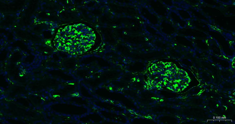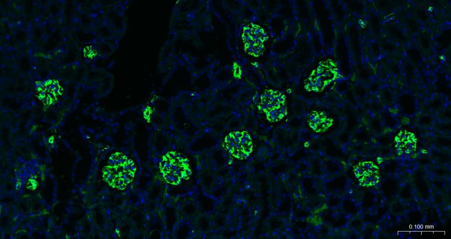 Paraformaldehyde-fixed, paraffin embedded Mouse Kidney; Antigen retrieval by boiling in sodium citrate buffer (pH6.0) for 15 min; Antibody incubation with Vimentin Polyclonal Antibody, Unconjugated (bs-8533R) at 1:200 overnight at 4°C. Followed by conjugated Goat Anti-Rabbit IgG antibody (green, bs-60295G-FITC), DAPI (blue, C02-04002) was used to stain the cell nuclei.
