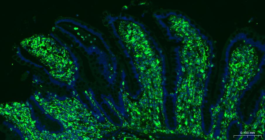 Paraformaldehyde-fixed, paraffin embedded Human Small Intestine; Antigen retrieval by boiling in sodium citrate buffer (pH6.0) for 15 min; Antibody incubation with Vimentin Polyclonal Antibody, Unconjugated (bs-8533R) at 1:200 overnight at 4°C. Followed by conjugated Goat Anti-Rabbit IgG antibody (green, bs-60295G-FITC), DAPI (blue, C02-04002) was used to stain the cell nuclei.