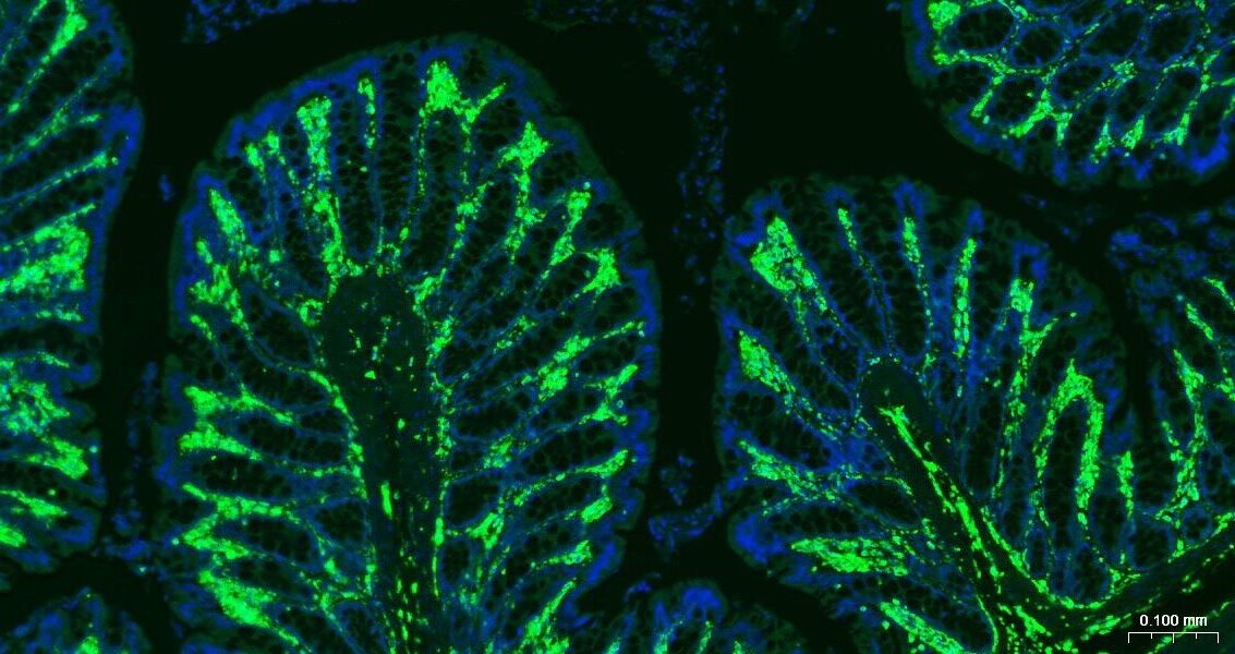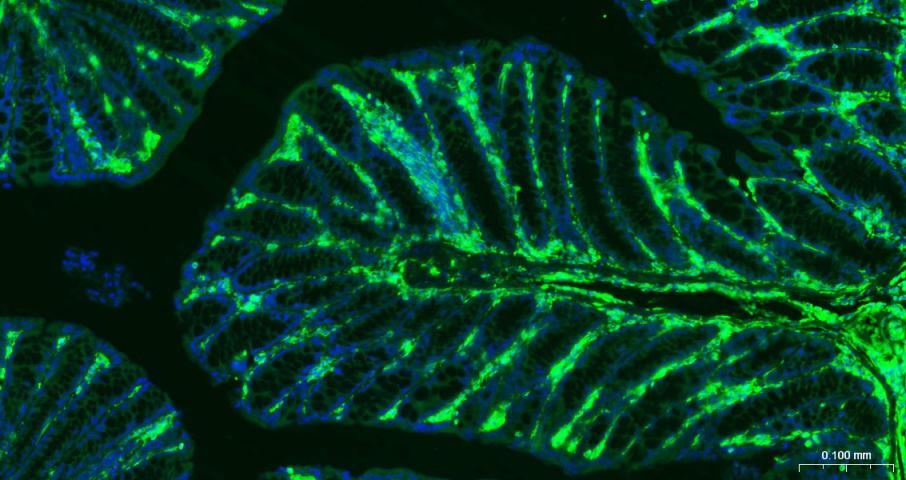 Paraformaldehyde-fixed, paraffin embedded Mouse Colon; Antigen retrieval by boiling in sodium citrate buffer (pH6.0) for 15 min; The section was incubated with Vimentin Polyclonal Antibody, Unconjugated (bs-8533R) at 1:200 overnight at 4°C. Followed by conjugated Goat Anti-Rabbit IgG antibody (green, bs-60295G-FITC), DAPI (blue, C02-04002) was used to stain the cell nuclei.