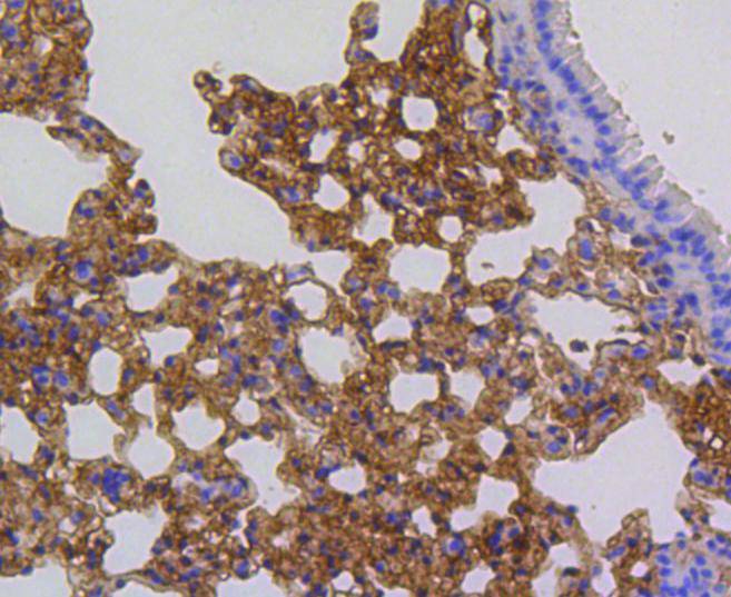 Immunohistochemical analysis of paraffin-embedded mouse lung tissue using anti-p16 ARC antibody. The section was pre-treated using heat mediated antigen retrieval with Tris-EDTA buffer (pH 9.0) for 20 minutes.The tissues were blocked in 1% BSA for 30 minutes at room temperature, washed with ddH2O and PBS, and then probed with the primary antibody (bsm-52302R, 1/50) for 30 minutes at room temperature. The detection was performed using an HRP conjugated compact polymer system. DAB was used as the chromogen. Tissues were counterstained with hematoxylin and mounted with DPX.