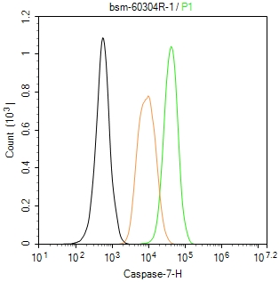 The Hela (H) cells were fixed with 4% PFA (10 min at r.t.) and then permeabilized with 90% ice-cold methanol for 20 min at -20℃,the cells then were incubated in 5%BSA to block non-specific protein-protein interactions (30 min at r.t.), followed by secondary antibody incubation for 40 min at room temperature. Primary Antibody (green):Rabbit Anti-Caspase-7 antibody (bsm-60304R,1:100); Isotype Control (orange): Rabbit IgG (bs-0295P). Blank control (black): PBS. Acquisition of 20,000 events was performed.
