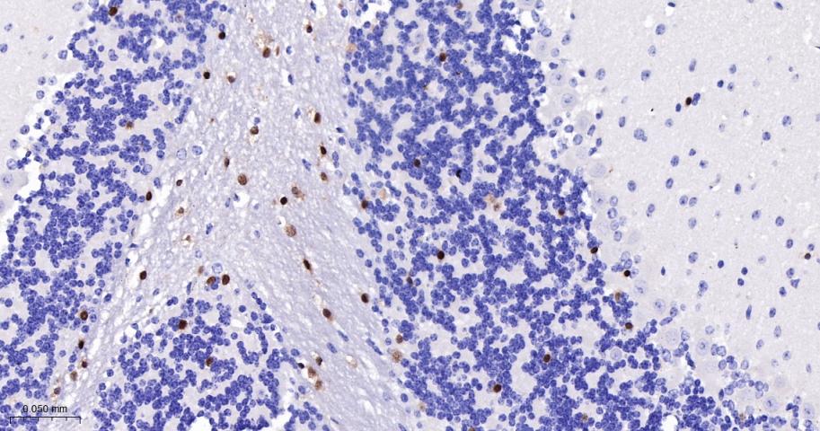 Paraformaldehyde-fixed, paraffin embedded Mouse Cerebellum; Antigen retrieval by boiling in sodium citrate buffer (pH6.0) for 15 min; The section was incubated with SOX10 Monoclonal Antibody, Unconjugated (bsm-60234R) at 1:300 overnight at 4°C, followed by conjugation to the bs-0295G-HRP and DAB (C-0010) staining.