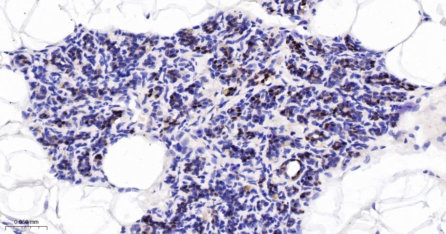 Paraformaldehyde-fixed, paraffin embedded Mouse Breast; Antigen retrieval by boiling in sodium citrate buffer (pH6.0) for 15 min; The section was incubated with SOX10 Monoclonal Antibody, Unconjugated (bsm-60234R) at 1:300 overnight at 4°C, followed by conjugation to the bs-0295G-HRP and DAB (C-0010) staining.
