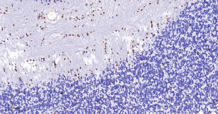 Paraformaldehyde-fixed, paraffin embedded Rat Cerebellum; Antigen retrieval by boiling in sodium citrate buffer (pH6.0) for 15 min; The section was incubated with SOX10 Monoclonal Antibody, Unconjugated (bsm-60234R) at 1:300 overnight at 4°C, followed by conjugation to the bs-0295G-HRP and DAB (C-0010) staining.