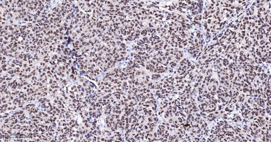 Paraformaldehyde-fixed, paraffin embedded Human melanoma; Antigen retrieval by boiling in sodium citrate buffer (pH6.0) for 15 min; The section was incubated with SOX10 Monoclonal Antibody, Unconjugated (bsm-60234R) at 1:300 overnight at 4°C, followed by conjugation to the bs-0295G-HRP and DAB (C-0010) staining.