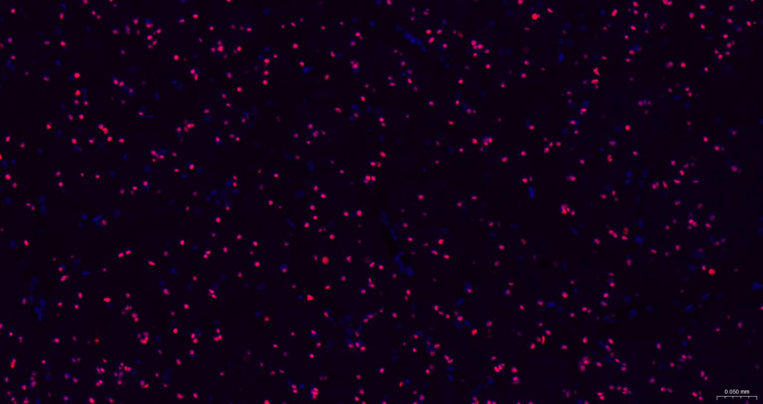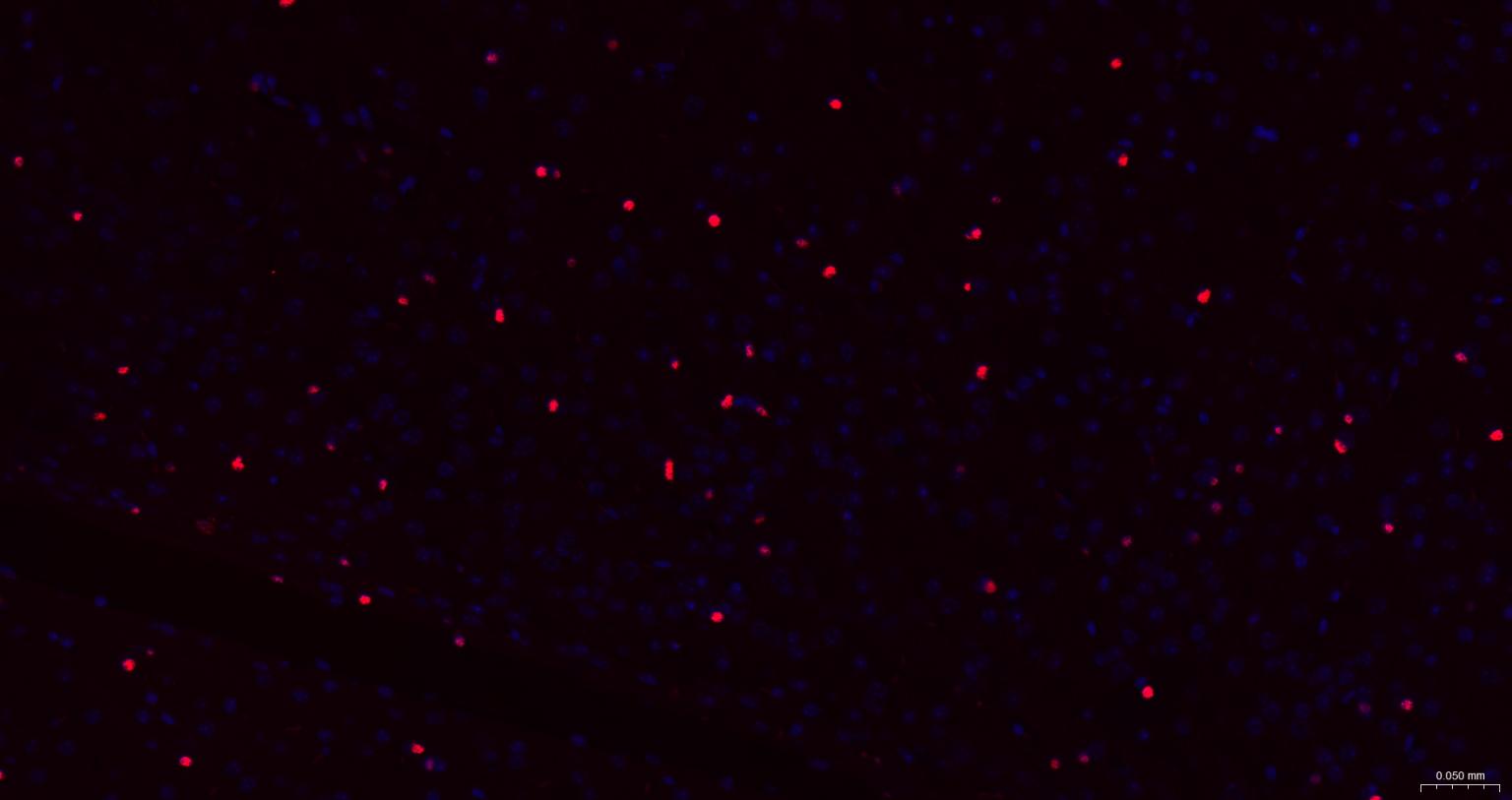 Paraformaldehyde-fixed, paraffin embedded Rat Cerebrum; Antigen retrieval by boiling in sodium citrate buffer (pH6.0) for 15 min; The section was incubated with SOX10 Monoclonal Antibody, Unconjugated (bsm-60234R) at 1:200 overnight at 4°C. Followed by conjugated Goat Anti-Rabbit IgG antibody (Red, bs-0295G-BF594), DAPI (blue, C02-04002) was used to stain the cell nuclei.