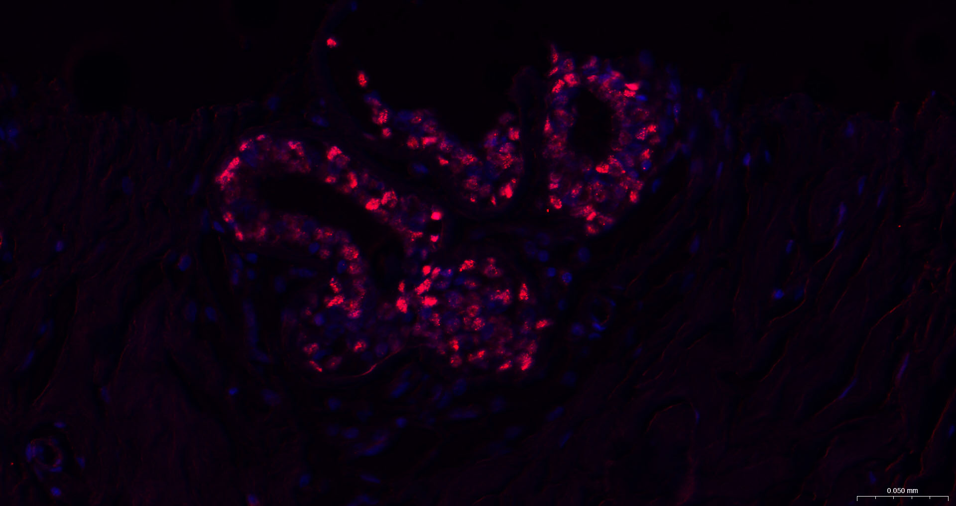 Paraformaldehyde-fixed, paraffin embedded Human Breast; Antigen retrieval by boiling in sodium citrate buffer (pH6.0) for 15 min; The section was incubated with SOX10 Monoclonal Antibody, Unconjugated (bsm-60234R) at 1:200 overnight at 4°C. Followed by conjugated Goat Anti-Rabbit IgG antibody (Red, bs-0295G-BF594), DAPI (blue, C02-04002) was used to stain the cell nuclei.