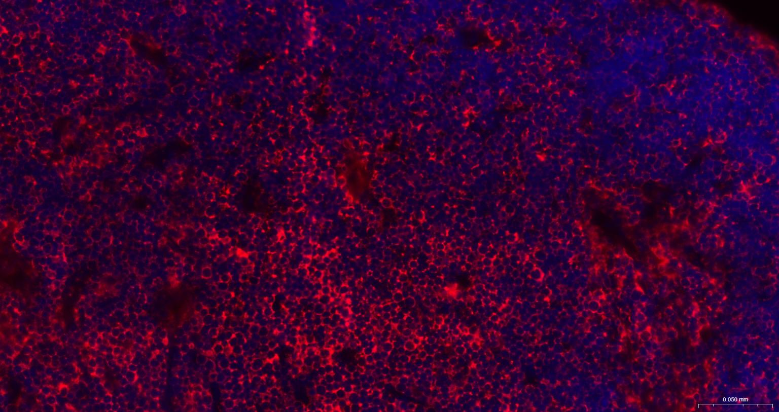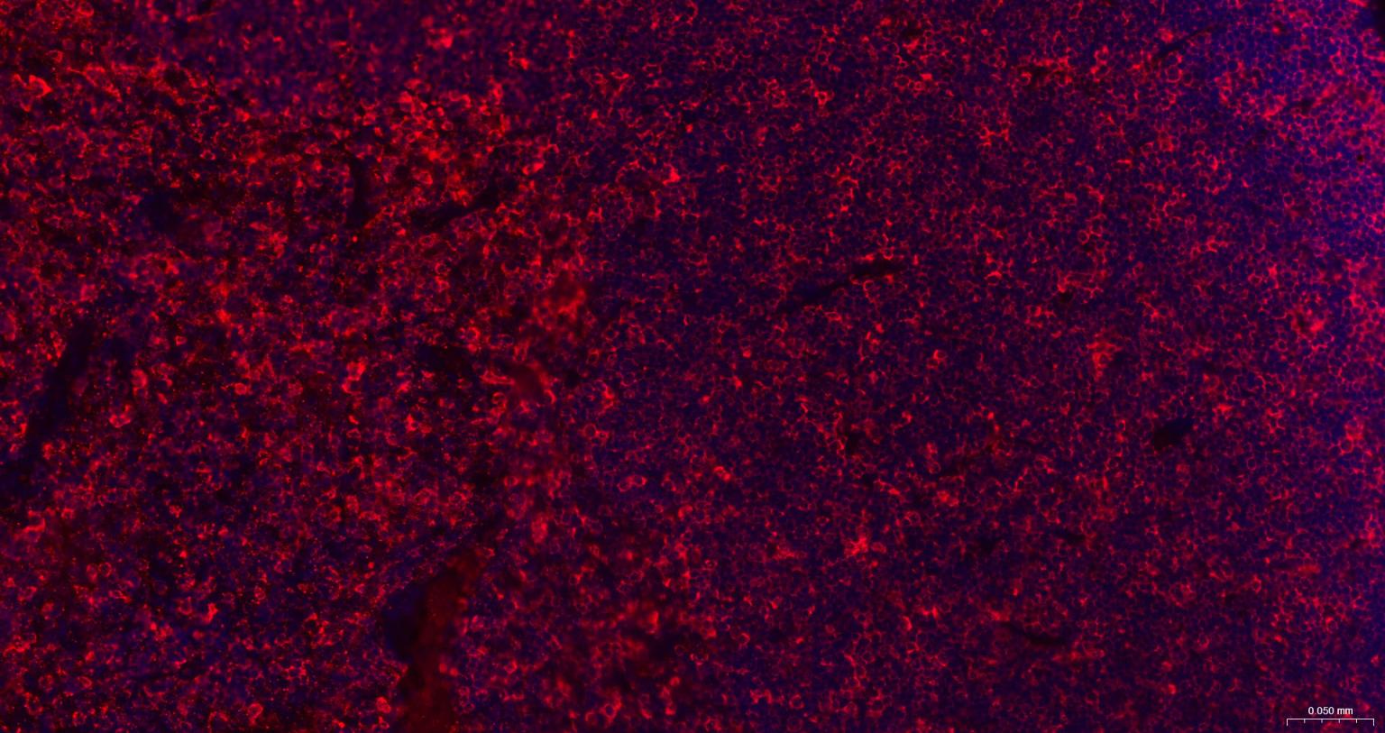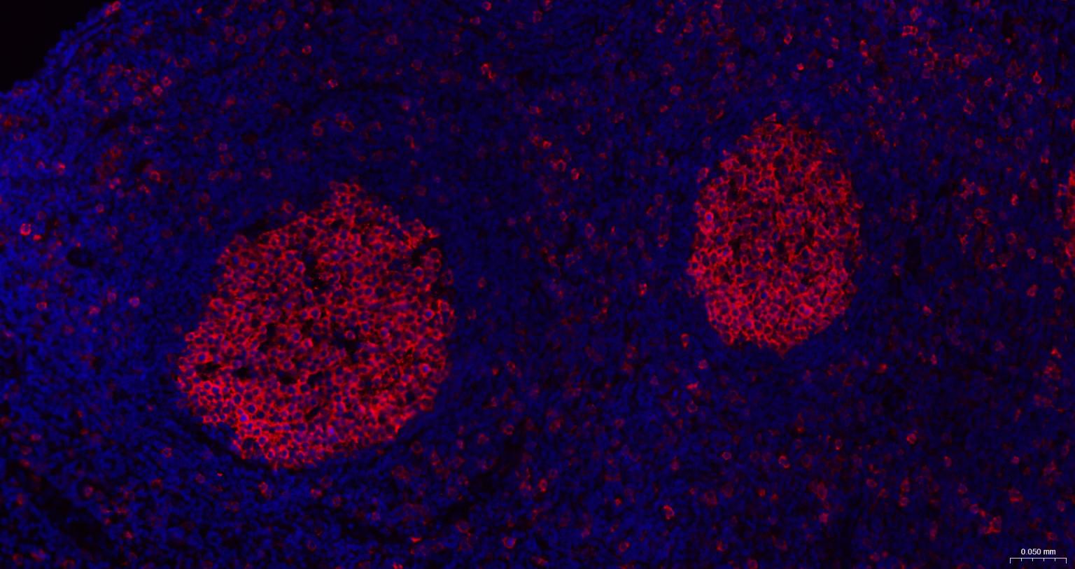 Paraformaldehyde-fixed, paraffin embedded Human Tonsil; Antigen retrieval by boiling in sodium citrate buffer (pH6.0) for 15 min; The section was incubated with STMN1 Monoclonal Antibody, Unconjugated (bsm-60306R) at 1:200 overnight at 4°C. Followed by conjugated Goat Anti-Rabbit IgG antibody (Red, bs-0295G-BF594), DAPI (blue, C02-04002) was used to stain the cell nuclei.