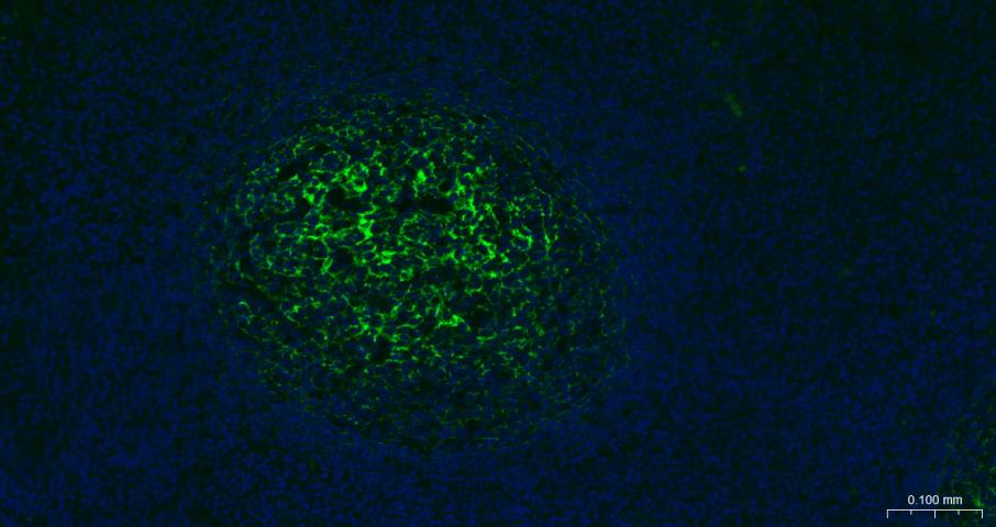 Paraformaldehyde-fixed, paraffin embedded Human Tonsil; Antigen retrieval by boiling in sodium citrate buffer (pH6.0) for 15 min; The section was incubated with CD35 Monoclonal Antibody, Unconjugated (bsm-60247R) at 1:200 overnight at 4°C. Followed by conjugated Goat Anti-Rabbit IgG antibody (green, bs-0295G-BF488), DAPI (blue, C02-04002) was used to stain the cell nuclei.