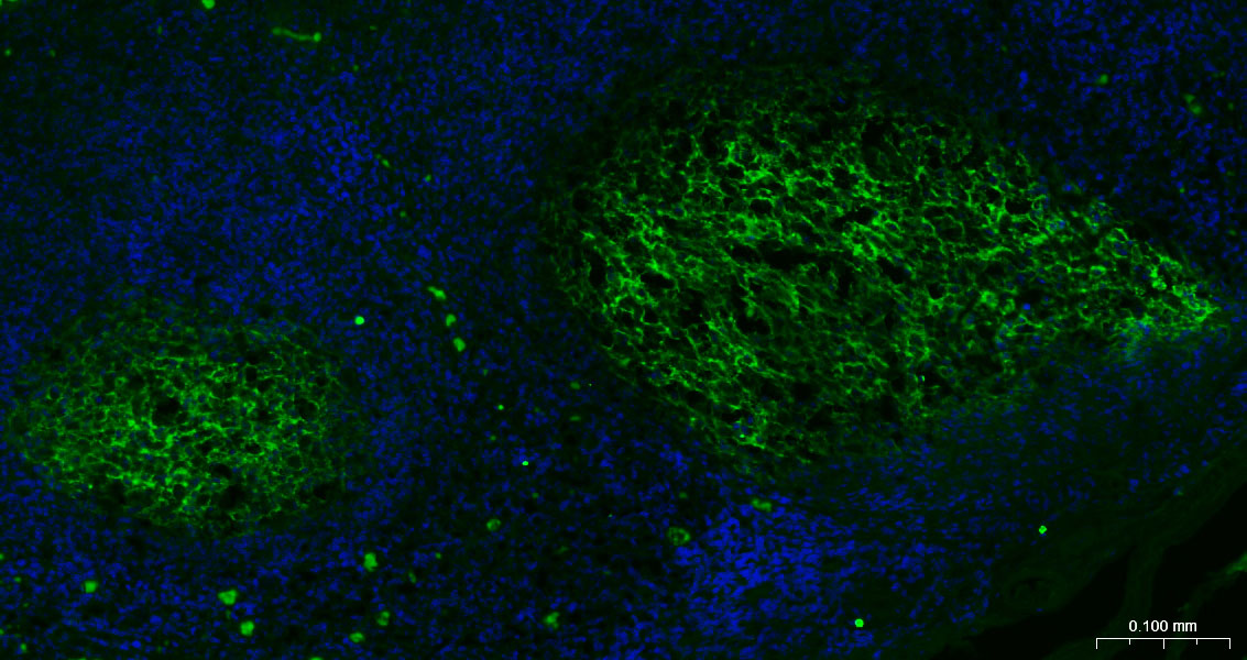 Paraformaldehyde-fixed, paraffin embedded Human Tonsil; Antigen retrieval by boiling in sodium citrate buffer (pH6.0) for 15 min; The section was incubated with CD23 Monoclonal Antibody, Unconjugated (bsm-60453R) at 1:200 overnight at 4°C. Followed by conjugated Goat Anti-Rabbit IgG antibody (green, bs-0295G-BF488), DAPI (blue, C02-04002) was used to stain the cell nuclei.