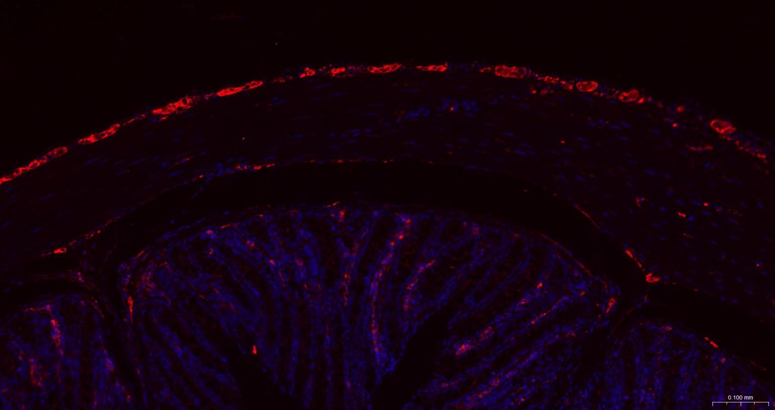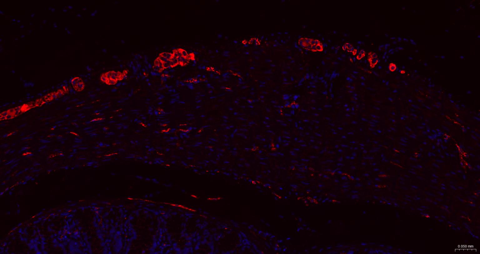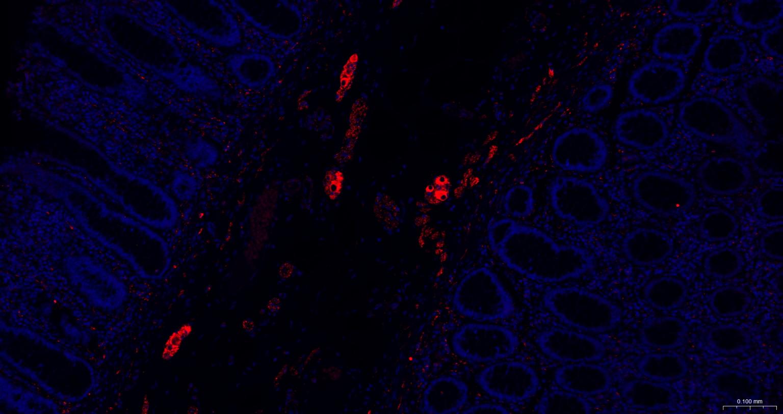 Paraformaldehyde-fixed, paraffin embedded Mouse Colon; Antigen retrieval by boiling in sodium citrate buffer (pH6.0) for 15 min; The section was incubated with MAPT/Tau Monoclonal Antibody, Unconjugated (bsm-41722M) at 1:200 overnight at 4°C. Followed by conjugated Goat Anti-Mouse IgG antibody (Red, bs-0296G-BF594), DAPI (blue, C02-04002) was used to stain the cell nuclei.