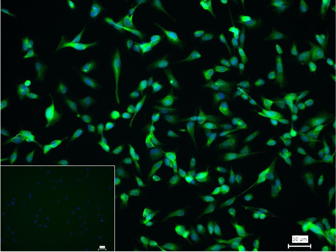 4% Paraformaldehyde-fixed U87-MG (H) cell; Triton X-100 at r.t. for 20 min; Antibody incubation with (GFAP) polyclonal Antibody, unconjugated (bs-42001R) 1:100, 90 min at 37°C; followed by conjugated Goat Anti-Rabbit IgG antibody (green, bs-40295G-FITC) at 37°C for 90 min, DAPI (blue, C02-04002) was used to stain the cell nuclei. PBS instead of the primary antibody was used as the blank control.