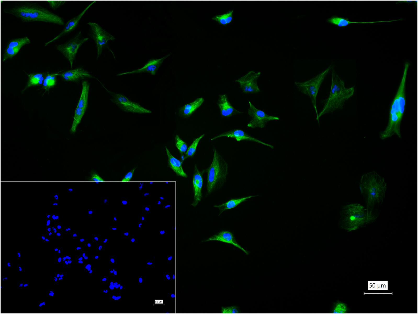 4% Paraformaldehyde-fixed U-251 MG (H) cell; Triton X-100 at r.t. for 20 min; Antibody incubation with (GFAP) polyclonal Antibody, unconjugated (bs-42001R) 1:100, 90 min at 37°C; followed by BF488 conjugated Goat Anti-Rabbit IgG antibody (green, bs-60295G-BF488) at 37°C for 90 min, DAPI (blue, C02-04002) was used to stain the cell nuclei. PBS instead of the primary antibody was used as the blank control.