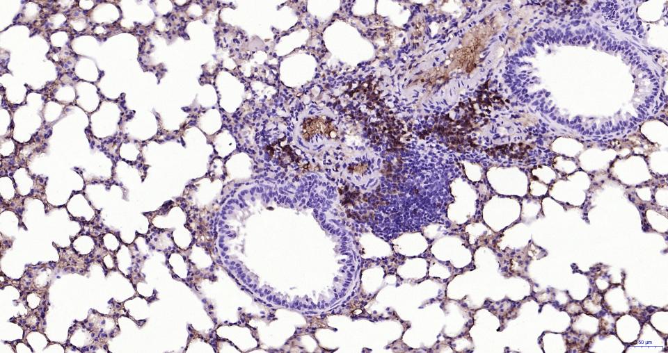 Paraformaldehyde-fixed, paraffin embedded Mouse lung; Antigen retrieval by boiling in sodium citrate buffer (pH6.0) for 15 min; Antibody incubation with Ly-6G Monoclonal Antibody, Unconjugated(bsm-30178A) at 1:200 overnight at 4°C, followed by conjugation to the bs-0293G-HRP and DAB (C-0010) staining.