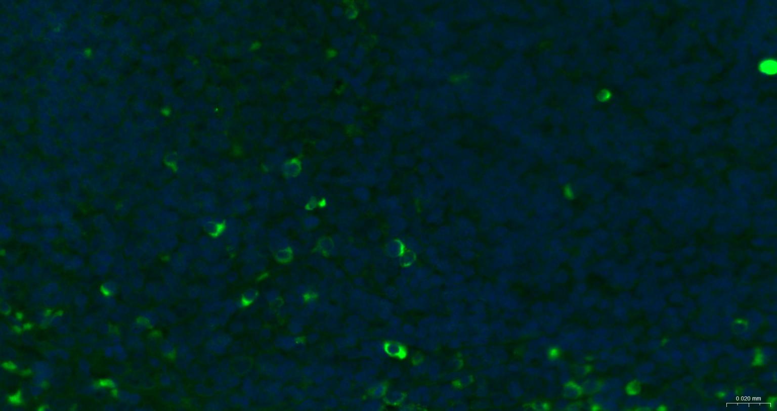Paraformaldehyde-fixed, paraffin embedded Mouse Spleen; Antigen retrieval by boiling in sodium citrate buffer (pH6.0) for 15 min; The section was incubated with mouse Ly-6G/Ly-6C Monoclonal Antibody, Unconjugated (bsm-30178A) at 1:200 overnight at 4°C. Followed by conjugated Goat Anti-Rat IgG antibody (green, bs-0293G-FITC), DAPI (blue, C02-04002) was used to stain the cell nuclei.