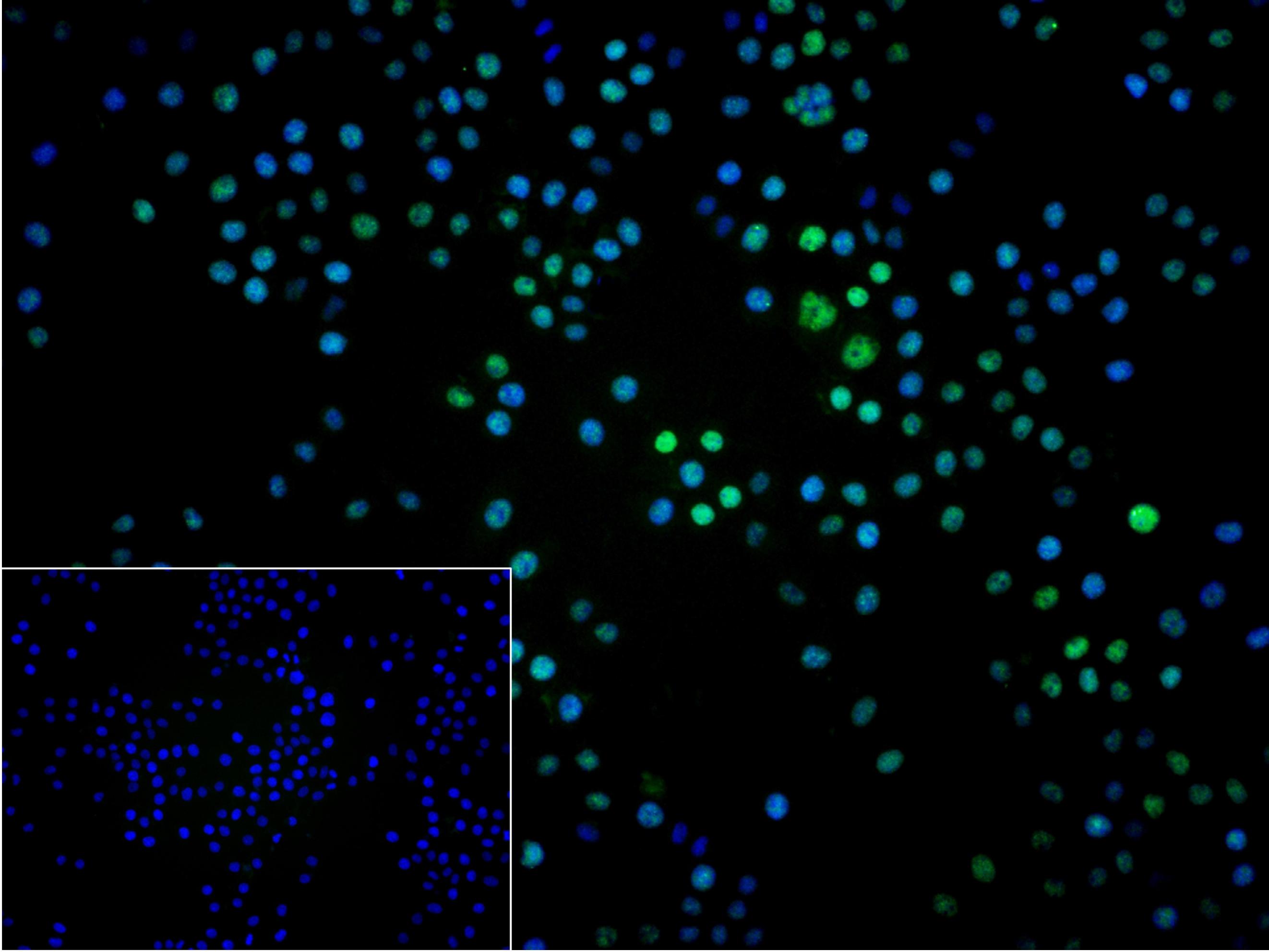 4% Paraformaldehyde-fixed Hela (H) cell; Triton X-100 at r.t. for 20 min; Antibody incubation with (RPA2) monoclonal Antibody, unconjugated (bsm-60629R) 1:100, 90 min at 37°C; followed by conjugated Goat Anti-Rabbit IgG antibody (green, bs-60295G-BF488) at 37°C for 90 min, DAPI (blue, C02-04002) was used to stain the cell nuclei. PBS instead of the primary antibody was used as the blank control.
