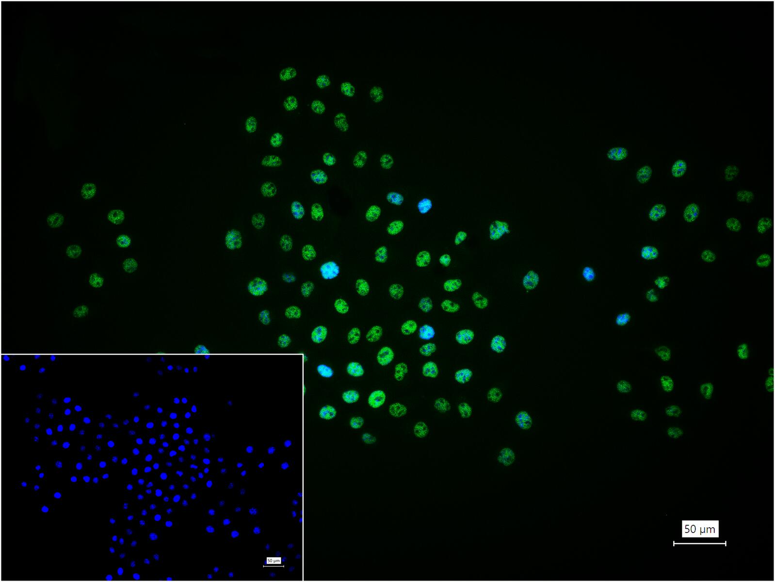 4% Paraformaldehyde-fixed HeLa (H) cell; Triton X-100 at r.t. for 20 min; Antibody incubation with (SET) monoclonal Antibody, unconjugated (bsm-54264R) 1:100, 90 min at 37°C; followed by BF488 conjugated Goat Anti-Rabbit IgG antibody (green, bs-60295G-BF488) at 37°C for 90 min, DAPI (blue, C02-04002) was used to stain the cell nuclei. PBS instead of the primary antibody was used as the blank control.