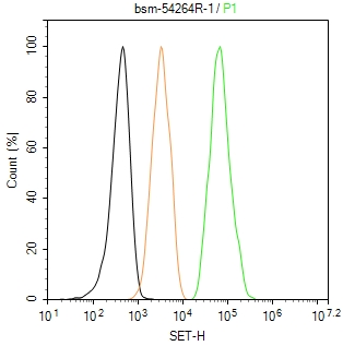 The HeLa (H) cells were fixed with 4% PFA (10 min at r.t.) and then permeabilized with 90% ice-cold methanol for 20 min at -20℃,the cells then were incubated in 5%BSA to block non-specific protein-protein interactions (30 min at r.t.), followed by secondary antibody incubation for 40 min at room temperature. Primary Antibody (green):Rabbit Anti-SET antibody (bsm-54264R,1:100); Isotype Control (orange): Rabbit IgG (bs-0295P). Blank control (black): PBS. Acquisition of 20,000 events was performed.