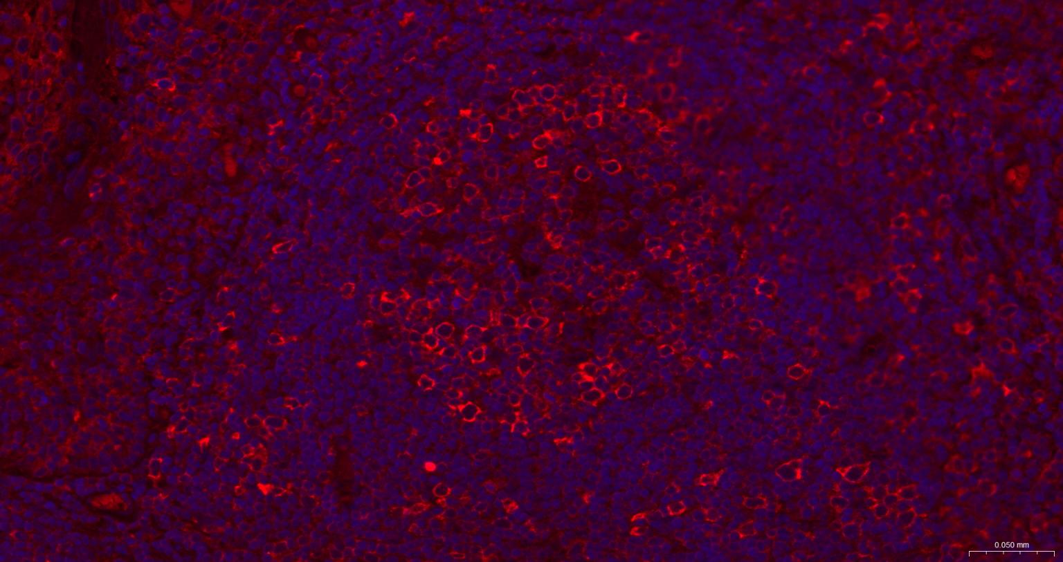 Paraformaldehyde-fixed, paraffin embedded Human Tonsil; Antigen retrieval by boiling in sodium citrate buffer (pH6.0) for 15 min; The section was incubated with GART Monoclonal Antibody, Unconjugated (bsm-52537R) at 1:200 overnight at 4°C. Followed by conjugated Goat Anti-Rabbit IgG antibody (Red, bs-0295G-BF594), DAPI (blue, C02-04002) was used to stain the cell nuclei.