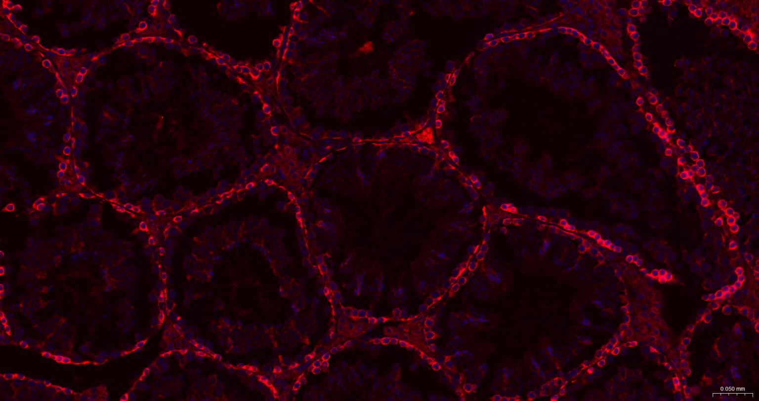 Paraformaldehyde-fixed, paraffin embedded Mouse Testicles; Antigen retrieval by boiling in sodium citrate buffer (pH6.0) for 15 min; The section was incubated with GART Monoclonal Antibody, Unconjugated (bsm-52537R) at 1:200 overnight at 4°C. Followed by conjugated Goat Anti-Rabbit IgG antibody (Red, bs-0295G-BF594), DAPI (blue, C02-04002) was used to stain the cell nuclei.
