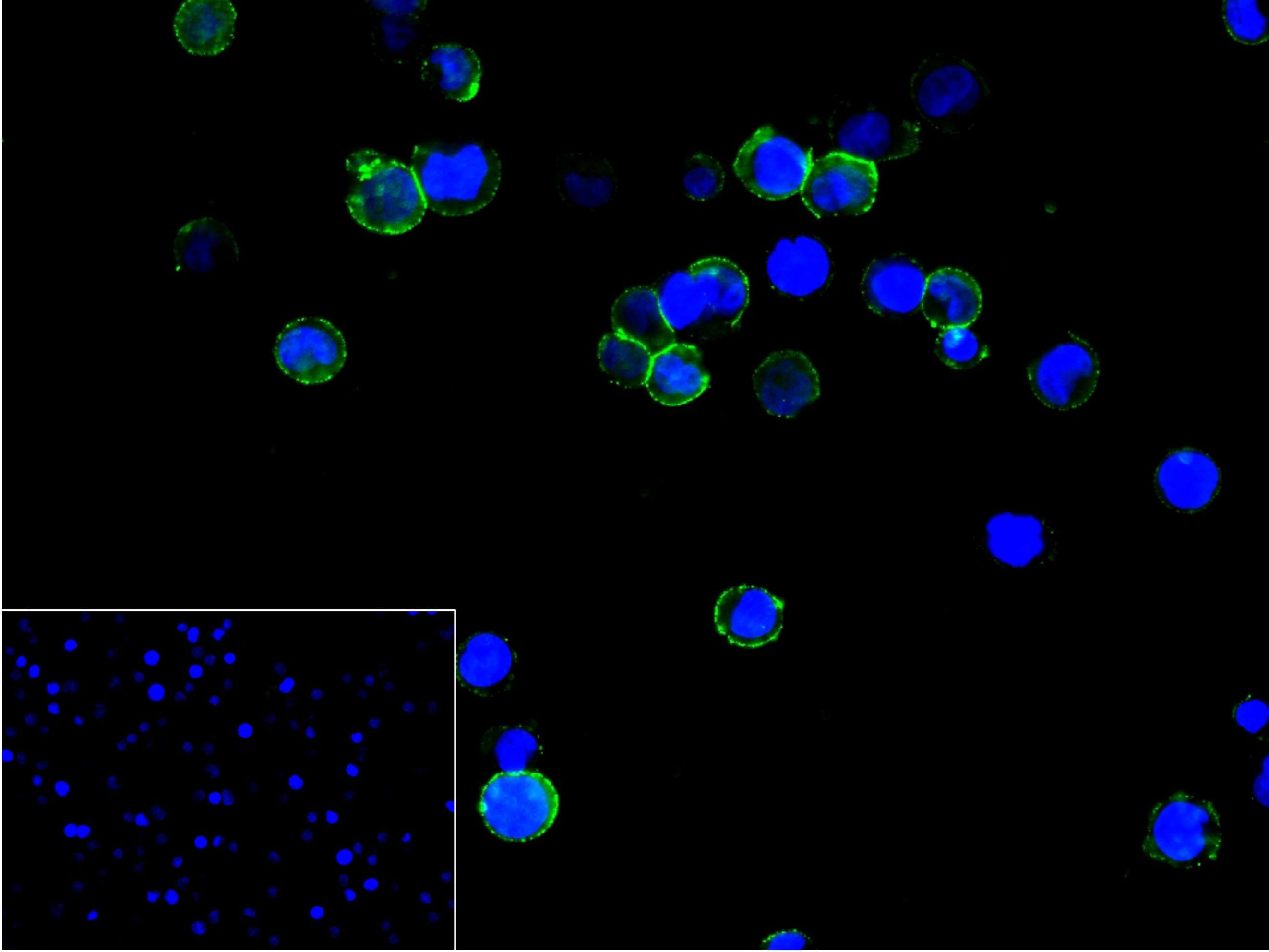 4% Paraformaldehyde-fixed THP-1 (H) cell; Antibody incubation with (CD68) monoclonal Antibody, unconjugated (bsm-52610R) 1:100, 90 min at 37°C; followed by conjugated Goat Anti-Rabbit IgG antibody (green, bs-60295G-BF488) at 37°C for 90 min, DAPI (blue, C02-04002) was used to stain the cell nuclei. PBS instead of the primary antibody was used as the blank control.