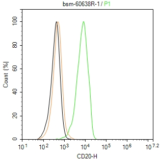 The Raji (H) cells were incubated in 5%BSA to block non-specific protein-protein interactions (30 min at r.t.) , followed by secondary antibody incubation for 40 min at room temperature. Primary Antibody (green): Rabbit Anti-CD20 antibody (bsm-60638R): 1 μg/10^6 cells; Isotype Control (orange): Rabbit IgG (bs-0295P). Blank control (black): PBS. Acquisition of 20,000 events was performed.