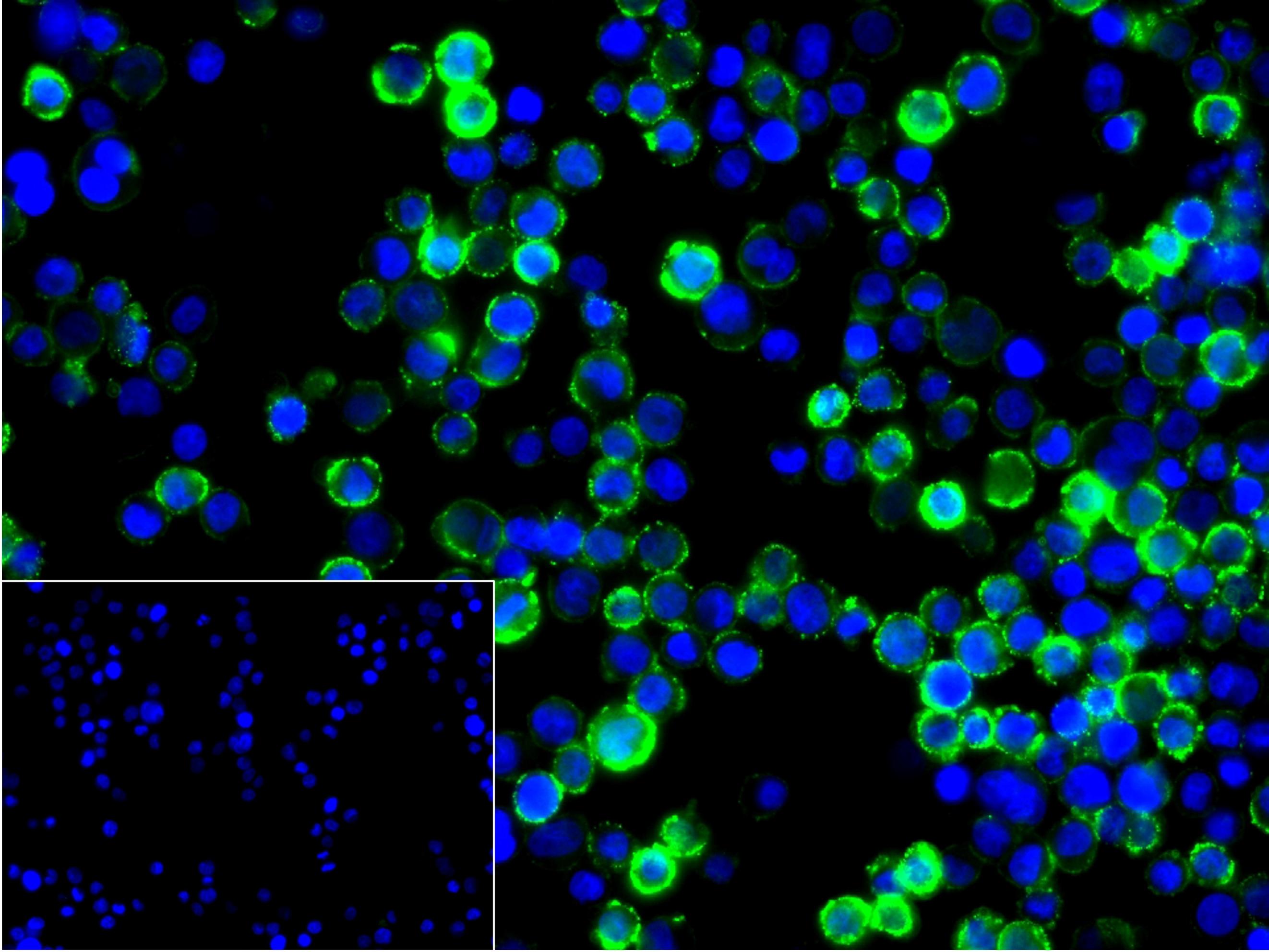 4% Paraformaldehyde-fixed Raji (H) cell; Antibody incubation with (CD20) monoclonal Antibody, unconjugated (bsm-60638R) 1:100, 90 min at 37°C; followed by conjugated Goat Anti-Rabbit IgG antibody (green, bs-60295G-BF488) at 37°C for 90 min, DAPI (blue, C02-04002) was used to stain the cell nuclei. PBS instead of the primary antibody was used as the blank control.