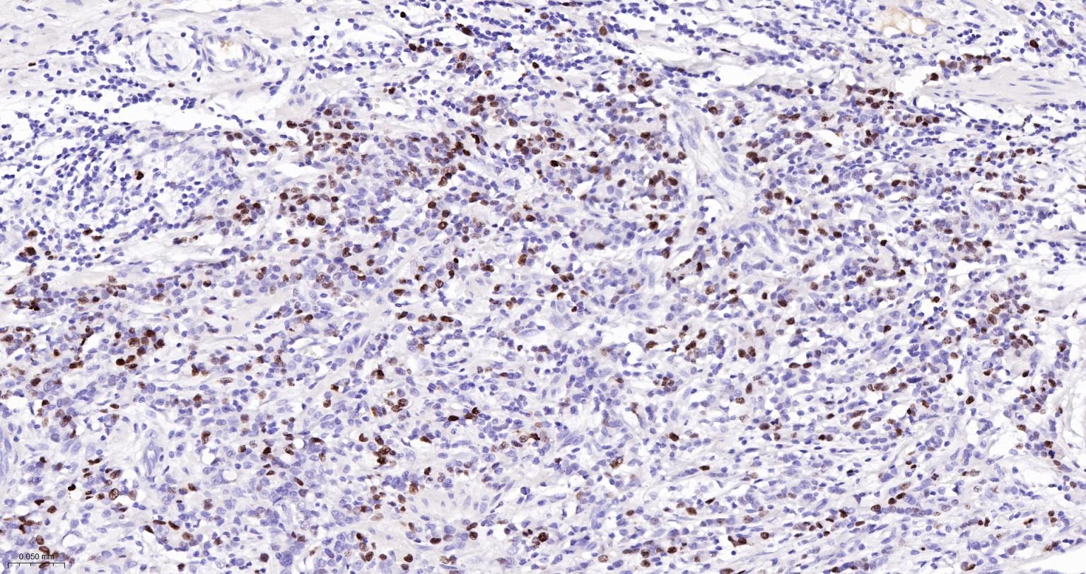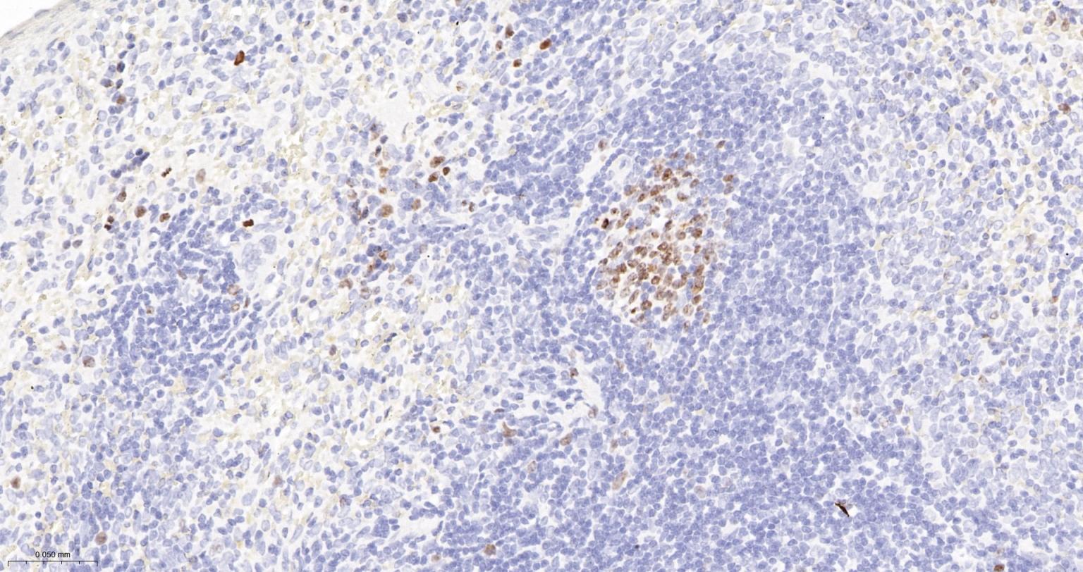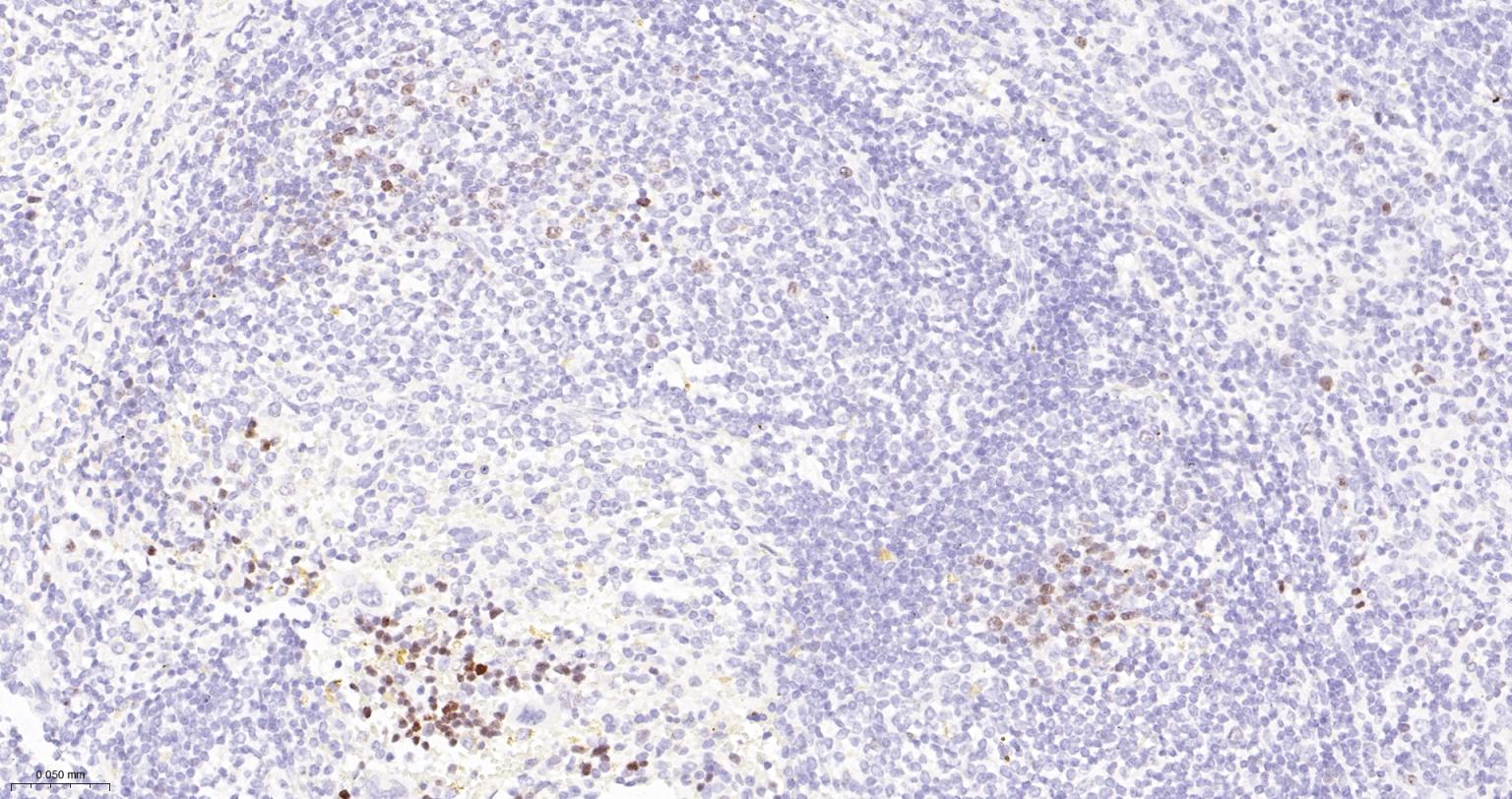Paraformaldehyde-fixed, paraffin embedded Human Spleen; Antigen retrieval by boiling in sodium citrate buffer (pH6.0) for 15 min; Antibody incubation with Ki67Monoclonal Antibody, Unconjugated(bsm-52455R) at 1:200 overnight at 4°C, followed by conjugation to the SP Kit (Rabbit, SP-0023) and DAB (C-0010) staining.