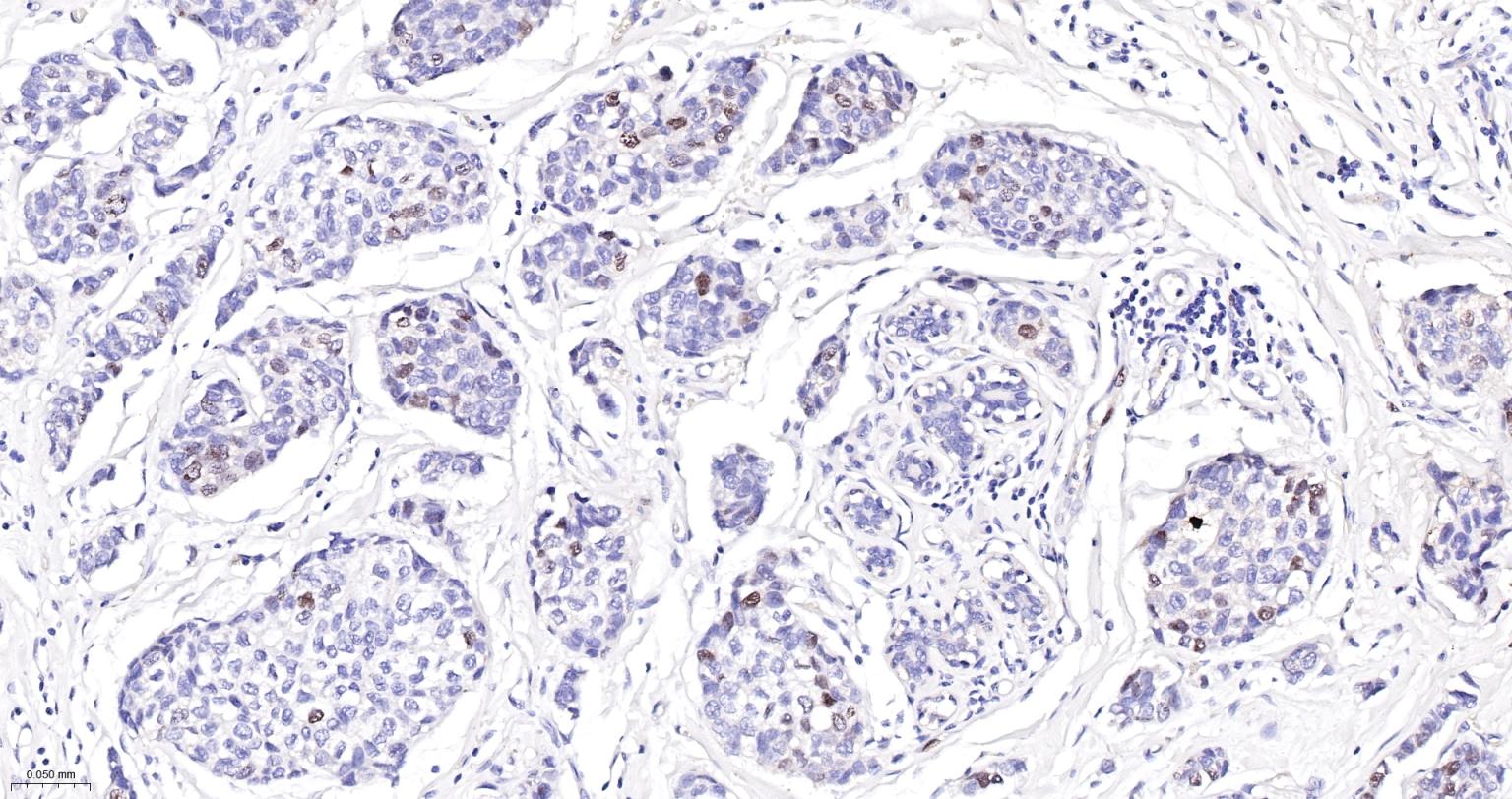 Paraformaldehyde-fixed, paraffin embedded Human Breast Cancer; Antigen retrieval by boiling in sodium citrate buffer (pH6.0) for 15 min; The section was incubated with Ki-67 Monoclonal Antibody, Unconjugated (bsm-52455R) at 1:200 overnight at 4°C, followed by conjugation to the bs-0295G-HRP and DAB (C-0010) staining.